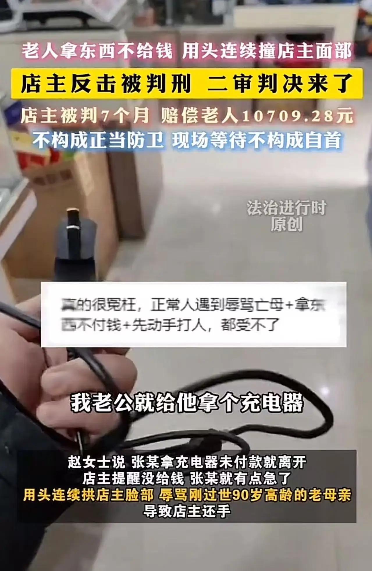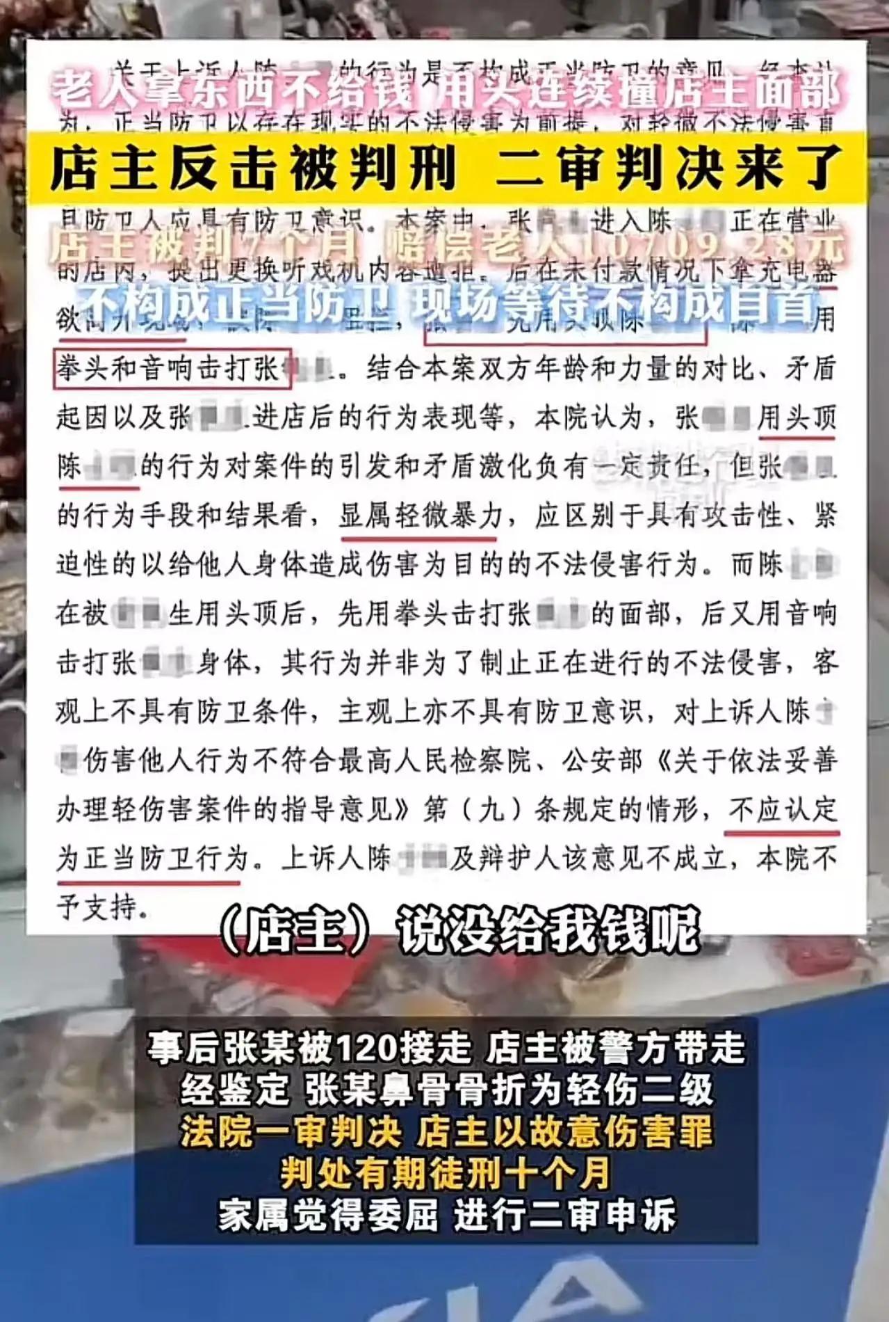 明明是他先动手,我老公正当防卫,凭什么把我老公判刑了?江苏徐州这判决,全网炸了! “明明是他先动手,我老公正当防卫,凭什么把我老公判刑了?”江苏徐州,赵女士对着镜头泣不成声,一句话戳中了无数普通人的软肋。 事情发生在2024年10月,徐州一家不起眼的小店。店主陈某像往常一样守店,一位老人张某拿着唱戏机进来,先是要求免费下载戏曲,陈某按店规说凭发票才能免费,老人拿不出,又说充电器坏了。陈某好心递上一个新充电器,老人试好后,竟直接揣进兜里,转身就要走。 “大爷,您还没付钱呢!”一句再正常不过的提醒,瞬间点燃了老人的怒火。他回头就骂,话越说越脏,最后竟恶毒辱骂陈某刚过世三个月的90岁老母亲——那是陈某心里最软、最痛的地方 。陈某气得浑身发抖,还没来得及理论,老人突然低头,用脑袋狠狠撞向他的脸,一下、两下、三下,连续猛拱,把他顶到店门口,柜台里的东西撒了一地。 被至亲受辱、被当众殴打,陈某的情绪彻底崩了。他抬手一拳打在老人脸上,又拿起店内音响砸了过去,被路人赶紧拉开。 谁也没想到,这一拳,把陈某从受害者打成了“罪犯”。老人鼻骨骨折,鉴定为轻伤二级;陈某被警方带走,一审以故意伤害罪判了10个月有期徒刑。家属不服上诉,二审法院认定老人有明显过错,减轻30%赔偿,但依旧不认定正当防卫,改判7个月,赔偿10709.28元。 守法经营、善意提醒,被白拿东西、被辱骂、被撞脸,还手自卫,换来的是牢狱之灾和近万元赔偿。消息一出,全网瞬间炸锅:“老人白拿东西还有理了?”“辱母撞脸都不能还手,那要怎么忍?”“这判决,让好人怎么敢做好人?” 很多人不解:法律不是说正当防卫吗?为什么到了这里就不算? 法院给出的理由是:陈某的反击超出了必要限度,不属于正当防卫;现场等待也不构成自首。可站在普通人的角度,谁能在被连续撞脸、被辱骂亡母的瞬间,还保持绝对冷静、精准控制力度?谁能在那种极致愤怒和屈辱下,还精准拿捏“防卫限度”? 这不是简单的打架,这是对人格尊严的践踏,是对底线的挑衅。母亲刚走,尸骨未寒,被人当众戳着脊梁骨骂,换作任何一个有血性的人,都忍不了 。老人先拿东西不付钱,先辱骂,先动手,全程挑衅,最后却成了“受害者”;店主守规矩、被欺负、反击,却成了“施暴者”。这不是“谁受伤谁有理”,又是什么? 我们理解法律要严谨,要讲证据、讲限度,但法律的温度,更在于守护普通人的公平正义,在于不让守法者受委屈,不让违法者占便宜 。两高一部早就明确:要防止“谁能闹谁有理”“谁死伤谁有理”,要捍卫“法不能向不法让步” 。可这起案件,却让无数人感到心寒:面对无理挑衅,我们到底该忍到什么程度?忍,就是受气、被欺负;不忍,就是犯法、坐牢。 这不是陈某一个人的委屈,是所有普通人的恐惧。我们都可能是那个守店的店主,都可能遇到白拿东西、撒泼耍赖、辱骂挑衅的人。如果连保护自己、保护尊严都要付出坐牢的代价,那以后谁还敢站出来说“不”?谁还敢维护自己的合法权益? 老人年纪大,不是撒泼的资本;受伤,也不是颠倒黑白的理由。法律保护弱者,但绝不保护恶人;尊重老人,但绝不纵容倚老卖老。我们要的不是“和稀泥”的判决,而是是非分明、惩恶扬善的公道 。 赵女士的哭声还在耳边:“我老公只是正当防卫,凭什么判刑?”这一问,问的是法律的公平,问的是人心的良知,问的是我们这个社会,到底该守护什么、鼓励什么。 愿每一个守法的人,都能被温柔以待;愿每一次正当的反击,都能被法律看见;愿“法不能向不法让步”,不再是一句口号,而是每一个普通人都能感受到的温暖与底气。 你觉得这判决合理吗?如果是你,被辱母、被撞脸,你会忍吗?评论区说说你的看法! 被打老公 丈夫被判杀人罪 律师正当防卫 山西正当防卫