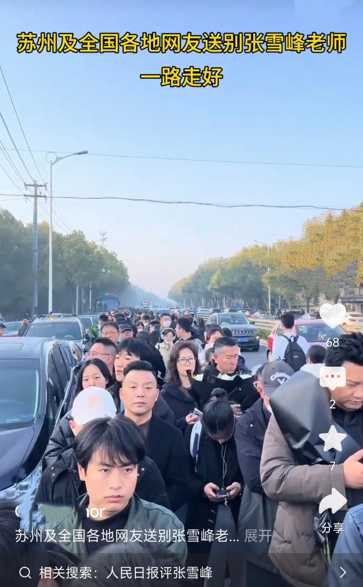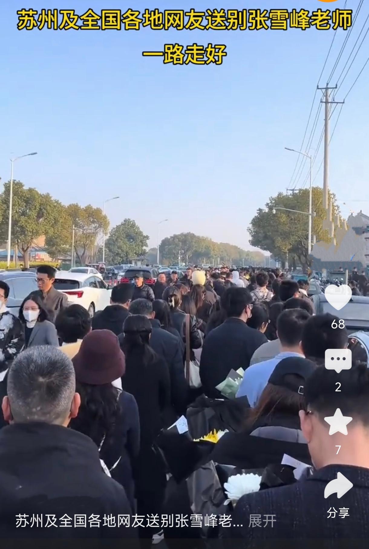张雪峰追悼会在苏州殡仪馆举行,群众自发排起长队为他送行!看到这一幕,让人泪目!上一次有这场景的还是袁隆平老先生。这种自发送别行为恰恰说明张老师在大家心目中的地位! 百姓的心最善良,谁为他们着想,他们就记你的好!张老师能有如此广泛的群众自发缅怀和追忆,可见凡是为百姓做点儿好事的人,百姓不会忘记。 我很喜欢张雪峰老师的人生观,他说教育是一件很严肃的事,容不得半点浮躁,为莘莘学子,指明前方路。 敬仰从来都是发自内心的甘心情愿,一个人为何值得这么多人的尊重和祭奠,因为他帮他们开启了美好的明天。 张雪峰收到这么多老百姓的认可,说明老百姓并不仇富,而是对那些财富来路不正的贪官和有钱人仇恨,老百姓心中有杆秤,再次证明了老百姓的眼睛是雪亮的。 一个普通老百姓,没一点背景,没一点官职,走的时候能有这样的待遇,此生无憾了,虽然您生命的长度有限,但却达到了他人穷尽一生都到不了的高度!张雪峰老师,愿您一路走好,来生再续辉煌!