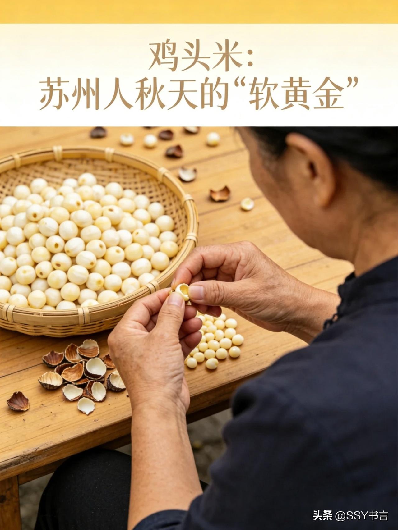 《鸡头米:苏州人秋天的“软黄金”》 鸡头米是苏州的时令珍馐,被誉为“水中人参”,每年秋天才上市。它的口感软糯清甜,带着淡淡的清香,最适合煮成糖水。一碗桂花鸡头米糖水,晶莹剔透的鸡头米浮在汤里,撒上一把干桂花,甜而不腻、香而不浓,是苏州人秋天独有的清润。因为产量少、剥取麻烦,鸡头米价格不低,但老苏州们依旧愿意为这一口鲜买单,毕竟这是属于江南的秋日限定。 苏州鸡头米 时令珍馐