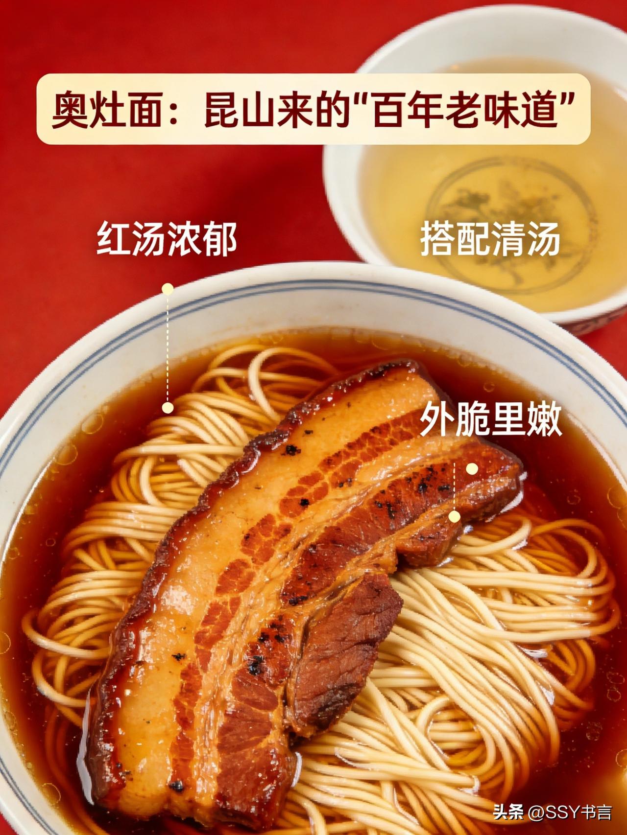 《奥灶面:昆山来的“百年老味道”》 奥灶面源自昆山,如今已是苏州人餐桌上的常客。它的精髓在于“奥灶”——红汤浓郁、白汤清鲜,面条细而筋道,浇头更是丰富:爆鱼、焖肉、鸭腿、素浇……每一种都有独特的风味。最地道的吃法是“红汤爆鱼面”,红汤鲜中带甜,爆鱼外脆里嫩,搭配一碗清汤,吃起来清爽不腻。哪怕是外地人,尝过一次也会被这碗面的鲜香征服。奥灶面 昆山美食