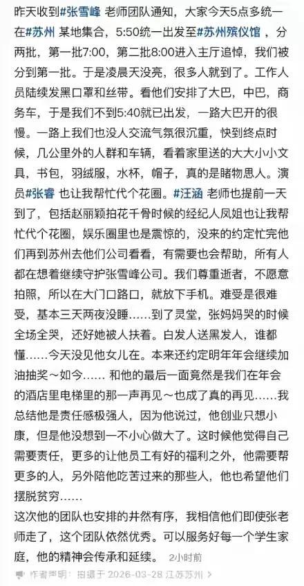 这回张雪峰错了。 他说苏州不堵车,但就在今天,2026年3月28日,苏州堵车了。 只因大家都要赶来见他最后一面。 经常看张雪峰视频的人都知道,他不止一回在镜头前夸苏州。 可他怎么也没料到,自己随口夸赞,会在今天被彻底打破。 打开导航一看,原本绿油油的顺畅路线,一点点变成浅黄,转眼就染成了大片刺眼的深红。 短短几公里的路,平时十几分钟就能跑完,今天硬是要耗上一两个小时,甚至更久。 现场没有网红举着手机直播蹭热度,没有刻意的煽情摆拍,只有满场沉静的肃穆,和藏不住的难过与不舍。 周边的花店,从半夜就开始有人来买花,白菊、白百合早就被抢购一空。 他太懂普通人的难处了,知道普通家庭的孩子,没有试错的资本,读书升学是改变命运最稳妥、最公平的路。 所以他从不摆架子,始终把自己放在和大家平等的位置,掏心窝子给建议,帮无数迷茫的学子拨开了眼前的迷雾,找准了前行的方向。 多少学生因为他的一句话,选对了适合自己的专业,顺利考上心仪的大学,毕业之后稳稳立足职场。 多少家长因为听了他的讲解,再也不用为孩子的志愿填报彻夜难眠,少走了数不清的弯路。 他没在传统的教室里讲过一堂文化课,不算课本上的任课老师,却成了无数学子和家长心里,最靠谱、最值得信赖的老师。 虽然也有人觉得他说话太直接、言辞犀利,对他有不同的看法。 但那些真正被他帮过、被他指导过的人,全都打心底里感念他的好,记着他的情。 他向来性子低调,总说自己做的都是小事,只是尽了分内之力,不值得大家过度宣扬,生前还多次提起,身后事一切从简,不想麻烦任何人。 大家心里都清楚,这不是跟风凑热闹,也不是走形式的客套,而是实打实的感激。 在这个快节奏的时代,真心为普通人着想、踏踏实实帮普通人办实事的人,总会被大家牢牢记在心里。 这份奔赴,无关热度,无关名利,只是单纯的不舍与感恩。 这场拥堵,不是城市交通出了问题,也不是路面管理不到位,而是无数颗心怀感激的心,不约而同凑在了一起。 长长的队伍慢慢向前挪动,没有人插队,没有人拥挤,大家都耐着性子等待,就想安安静静送他最后一程。 大家都不说太多煽情的话,心里只有一句简单的道别,道一声一路走好,念一份往日的恩情。 这世间最好的口碑,从来不是自己吹嘘出来的,也不是别人刻意捧出来的,而是实实在在为别人做了事、帮别人解了难,自然会被大家放在心上,用最真诚的方式来回馈。 这场突如其来的拥堵,不是城市的缺憾,而是人心的奔赴,是情义的汇聚。 每一辆堵在路上的车,每一个步行赶路的人,每一束轻轻捧着的鲜花,都是对他最好的道别。 如今,无数被他温暖过的普通人,用一场无声的拥堵,回馈给他一份沉甸甸的敬意和不舍。 这场漫长的拥堵,终究会慢慢散去,街道会恢复往日的畅通,苏州也会变回他口中那个不堵车的安逸城市。 可藏在人们心底的那份感激,永远不会散去。 他留给世人的,不只是一堆实用的升学填报技巧,不只是避坑指南,更是一份接地气的真诚,一份甘愿为普通人发声、为普通人撑腰的初心。 在无数被他帮助过、被他温暖过的人心里,他从来都不是一个匆匆过客,而是真正照亮过人生道路的引路人。 对于这件事,您有什么想说的吗?欢迎评论区留言讨论。