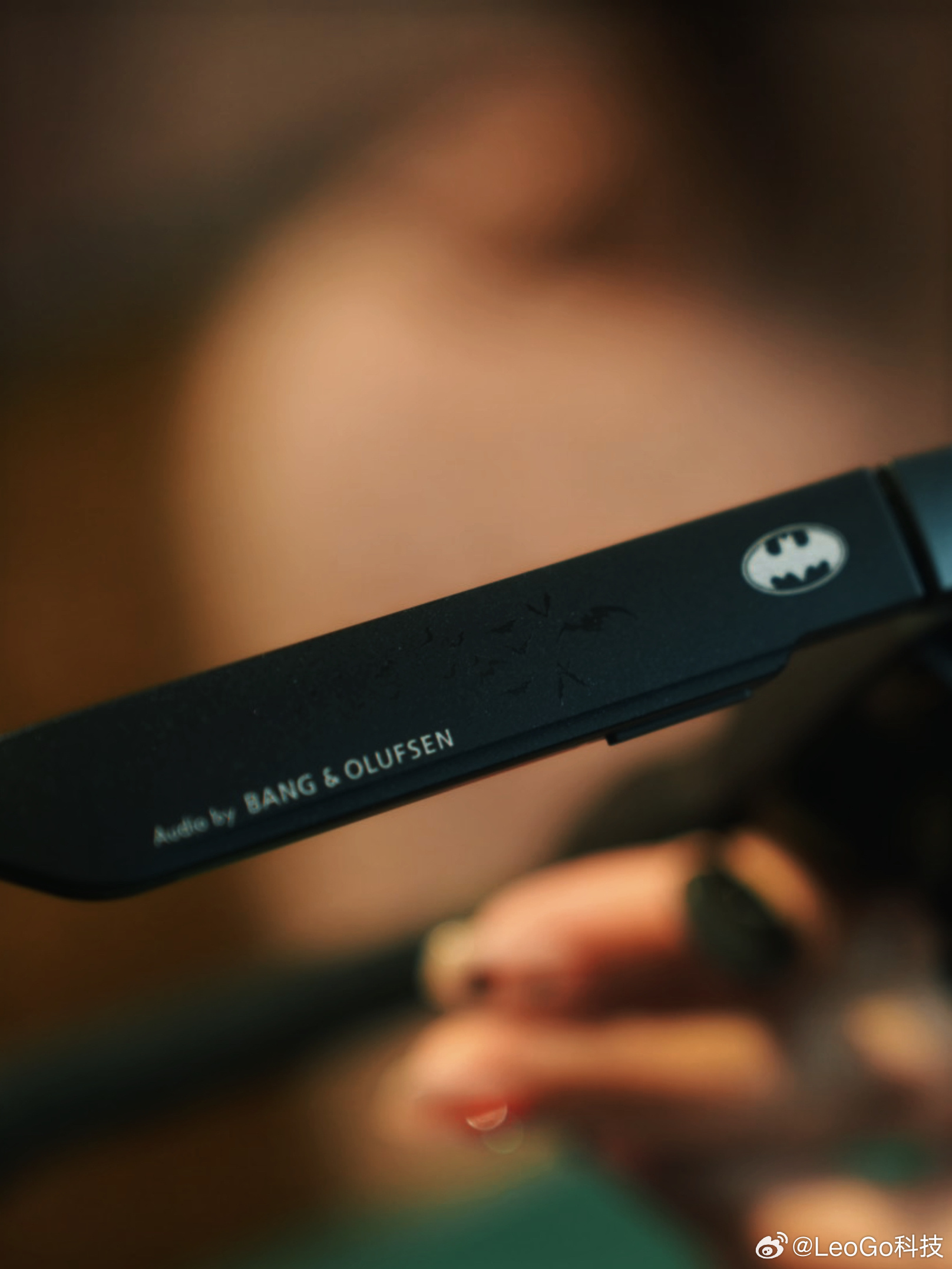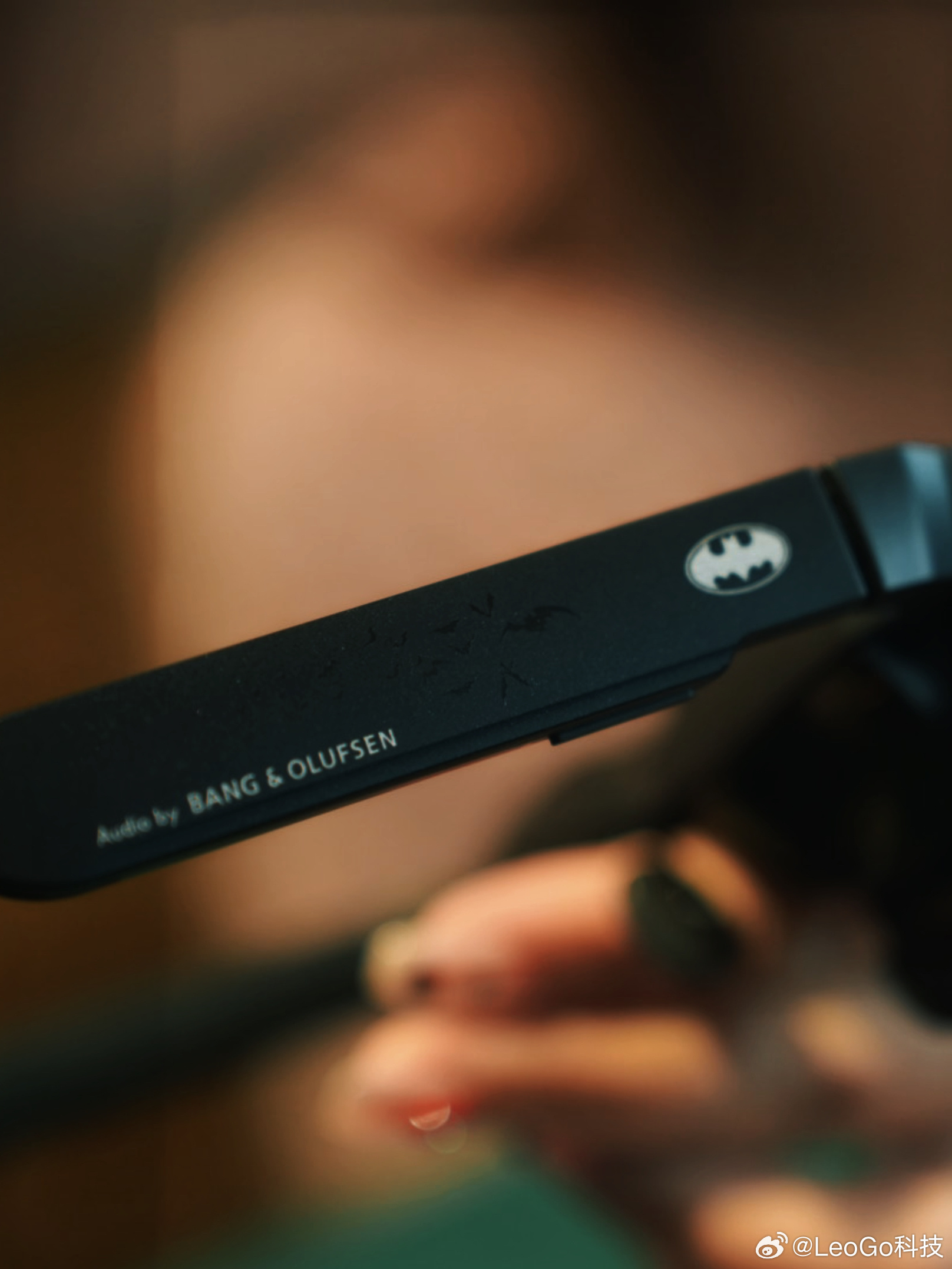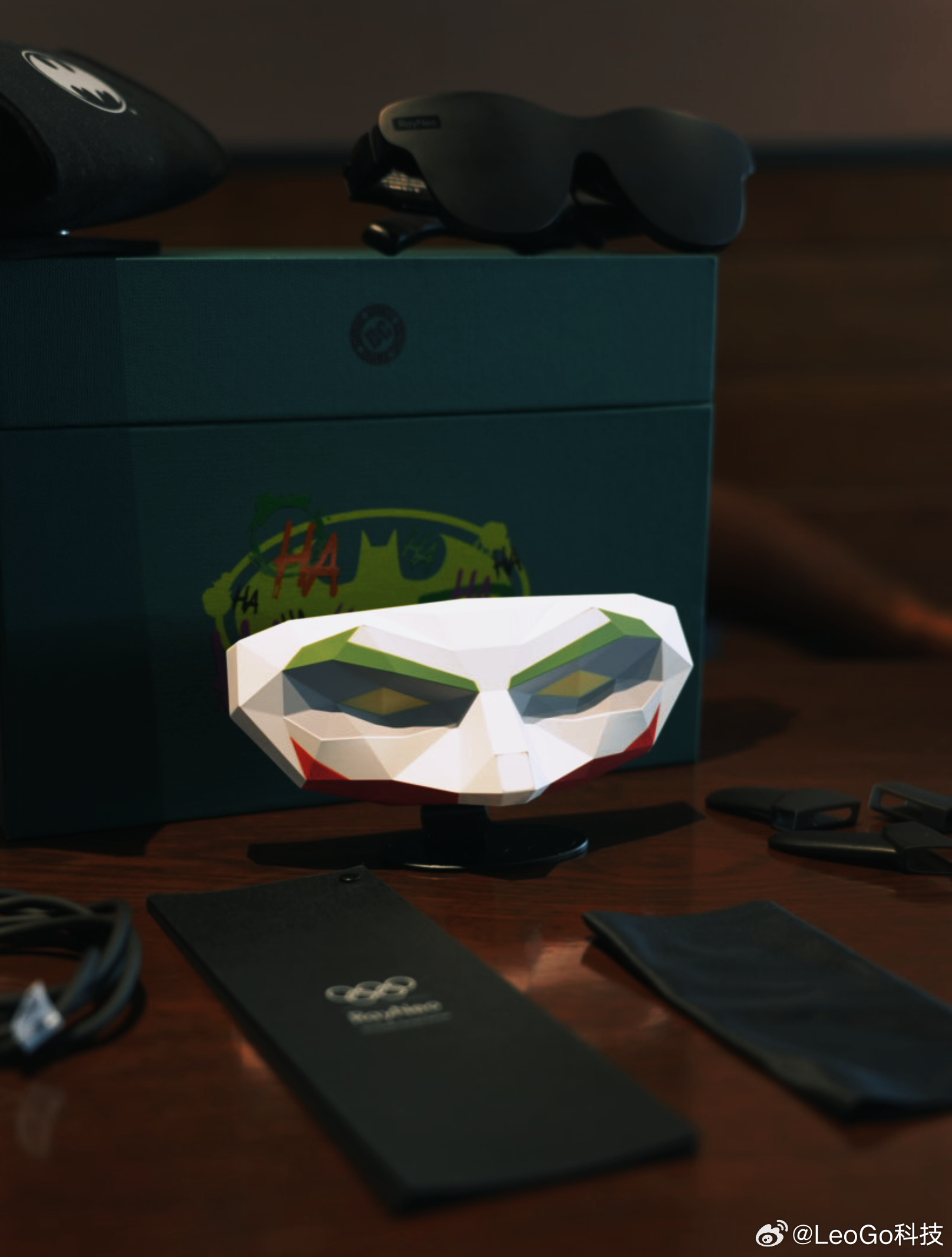 收到这个盒子的时候,我承认我有点小激动。我这款是混沌限定版,小丑主题。遮光罩直接卡在眼镜上,仪式感一下就出来了。镜腿上有蝙蝠侠logo和B&O标识,细节控表示很满足。
