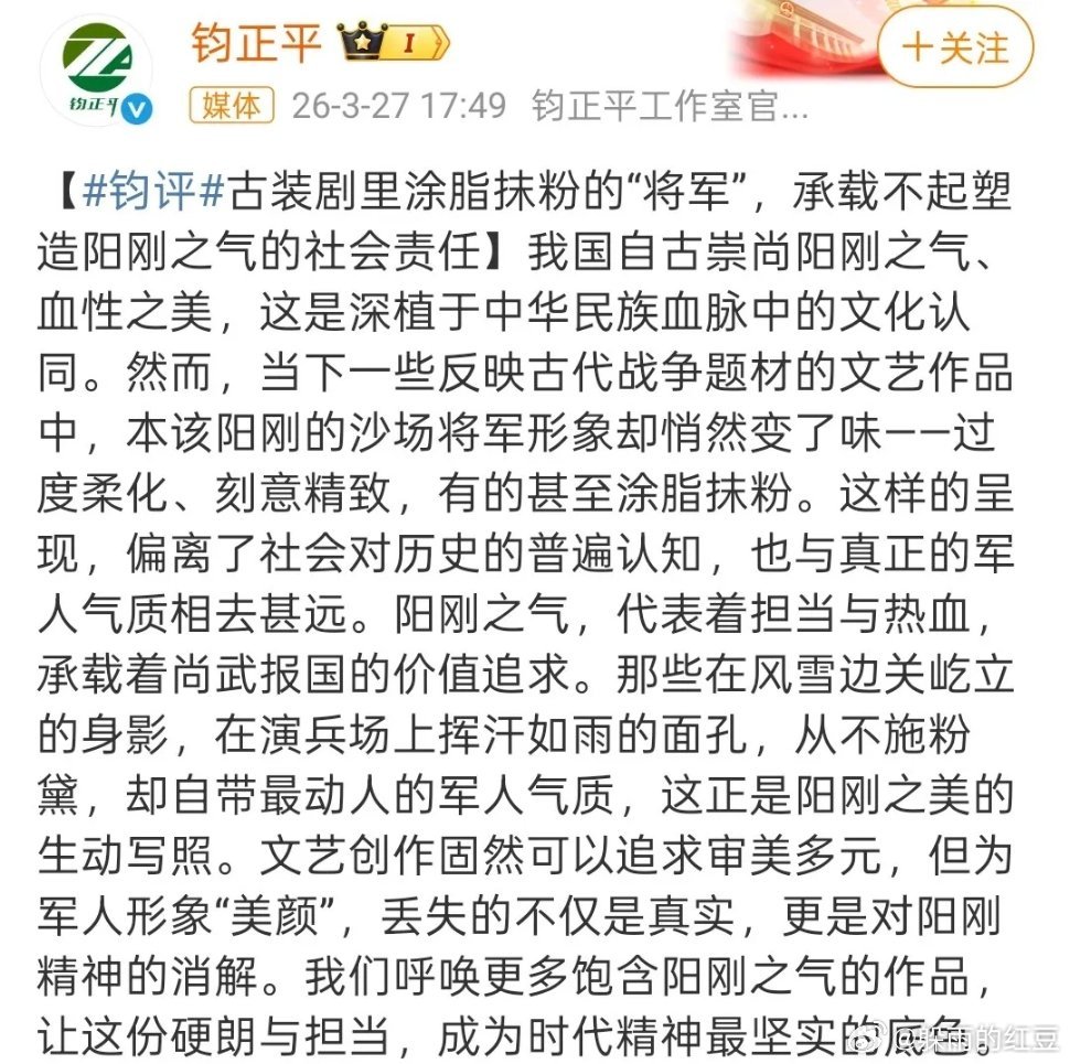 据悉,钧正评针对《逐玉》发了短评,批评粉底液将军承载不起塑造阳刚之气的社会责任。如果查一查这个钧正平的来历,就知道这次批评的分量有多重。