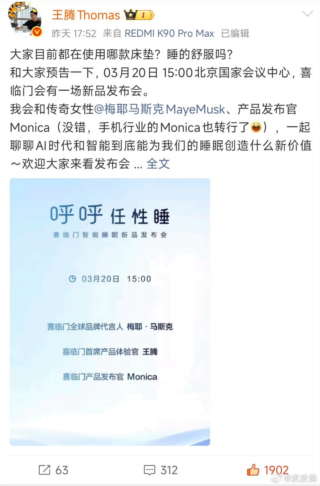喜临门紧急冻结9亿元账户喜临门前几天不是才邀请王腾和莫妮卡去参加新品发布会的吗?