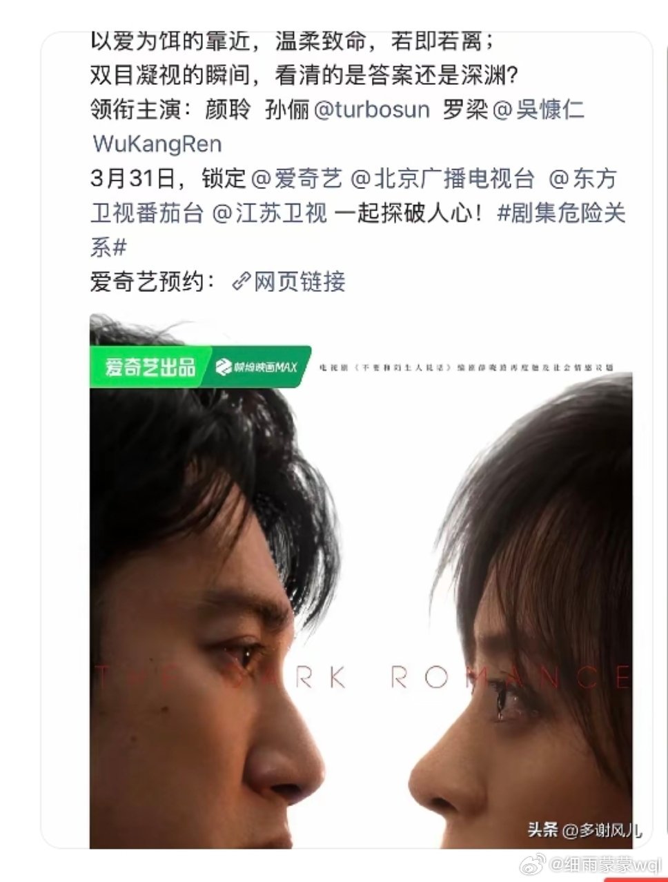 “娘娘”孙俪的新剧《危险关系》这排面大啊,北京、东方、江苏三台联播。3月27日,孙俪的新剧《危险关系》宣布定档,将于3月31日播出。孙俪在电视剧界的地位太高了,加上这几年她参演的剧不多,平均一年大概才一部,作为收视保障的孙俪新剧一出,头部卫视抢着播出也是情理之中。该剧由孙俪和吴慷仁主演,看介绍介于悬疑和剧情片之间,元素涉及情感pua,看了预告还是蛮期待的,希望在探讨人心方面不要泛泛而谈,来点深度