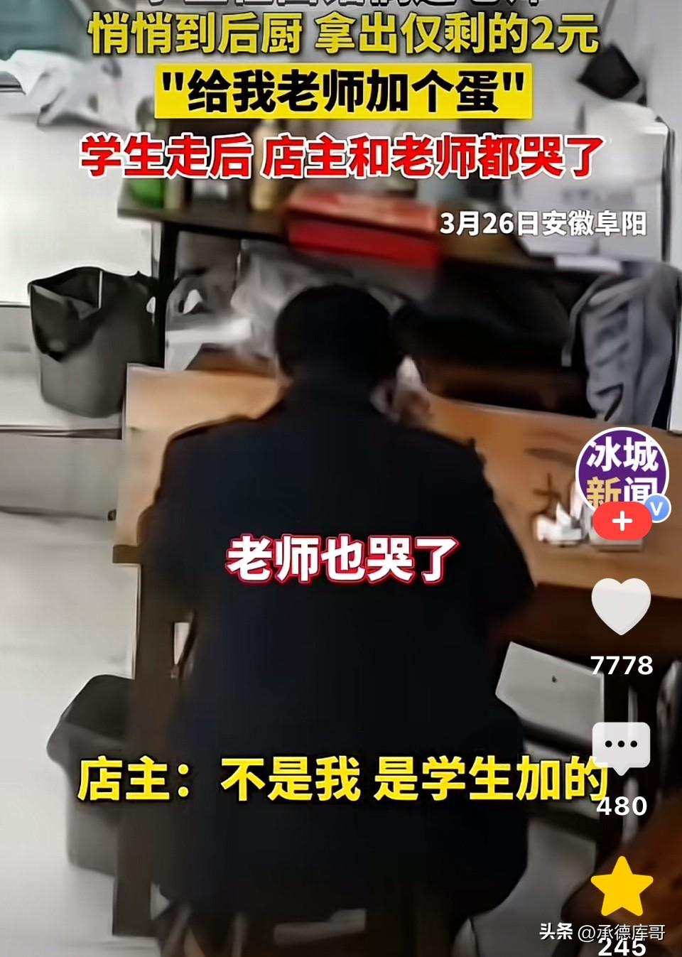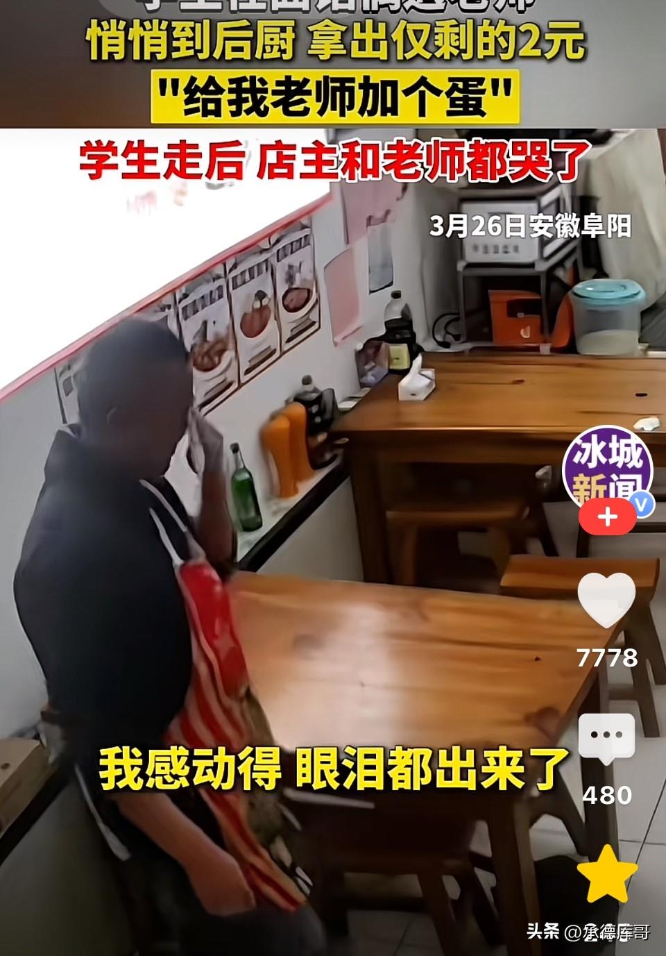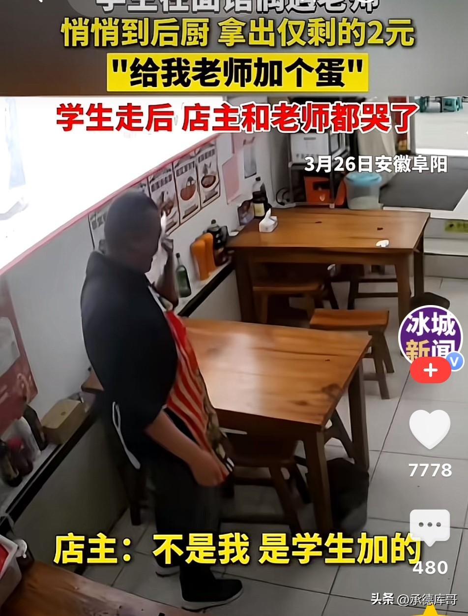 安徽阜阳,学生在面馆吃饭偶遇老师也来吃面,学生偷偷跑到后厨用手机给老板打了一行字。接下来发生的事情把老师和老板都感动的哭了! 在阜阳一家不起眼的面馆角落里, 三名正在吃饭的学生,看到自己的老师也走进来吃面。 老师坐下后点了一碗素面。 学生们没有上前寒暄,而是偷偷跑到后厨,用手机打字说道:我只剩2元钱了,外面是我们的老师,帮忙给老师加个蛋吧,不要跟老师说。” 付完钱学生们离开饭馆,经过老师座位时很礼貌的和老师打招呼:老师好!老师拜拜! 老师看到有学生向自己打招呼也很有礼貌的向同学挥手点头回应到:好好! 一会老板端上了老师要的素面,老师却发现碗里多了个卤鸡蛋,以为是老板送的,连声道谢。 为避免误会,男孩吃完面离开后,老板主动上前,向老师说明了真相:“这枚蛋不是我加的,是刚才那几个学生,用自己仅剩的2元钱给您加的,他们特意嘱咐我,不要告诉您。” 老师抬头寻找,学生早已悄悄离开。老师望着碗里的鸡蛋眼泪也止不住流了下来……. 老板望着老师用纸巾擦泪的样子不禁感动的哭了! 此事发生后也引发了网友热议,有的网友说,班上有个孤儿(六年级),住在福利院,有一天别人送了她一个糖,她守在教室门口好久,等我辅导完作业出来,硬要塞给我!当场泪崩! 也有的说,现实:多半是坐最后排的学生,学习成绩不敢恭维,德育方面却优秀到骨子里。 还有的说,懂得感恩,教育已经成功! 说实话,看到这个故事,我也红了眼眶。不是因为这件事有多惊天动地,恰恰是它的平凡和微小,戳中了人心里最柔软的地方。 两块钱,对很多人来说根本不算什么。但对一个学生来说,那可能是他口袋里仅剩的全部。他本可以留着买瓶水,或者攒着明天再用。但他没有犹豫,全部用来给老师加了一个蛋。 更让人动容的是,他选择了“偷偷”的方式。他没有跑到老师面前邀功,没有借此表现自己,而是悄悄做完这件事,然后默默离开。这种不声张的善良,比任何豪言壮语都更有力量。 在这个动辄谈钱、谈利益的时代,我们见过太多“精致的利己主义者”。而这孩子用两块钱告诉我们,最珍贵的不是你有多少钱,而是你愿意为别人付出多少。 那个老师值得感动。能被学生这样惦记,说明他平时一定是个好老师。 这枚鸡蛋,可能是老师吃过的最贵的一枚——不是因为它的价格,而是因为它承载着一个孩子最纯粹的心意。 人间烟火气,最抚凡人心。愿我们都能记得,在这个世界上,总有人用最朴素的方式,爱着这个世界,爱着身边的人。