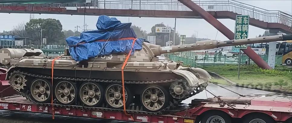 罕见涂装的某新型坦克,在国际庄某地使用平板车进行运输。经典五对轮的行走机构,中部偏后的抽烟装置,105毫米坦克炮,都指向是五对轮的最后改进型号。这玩意配上这涂装,难道是海外装备回国大修吗?