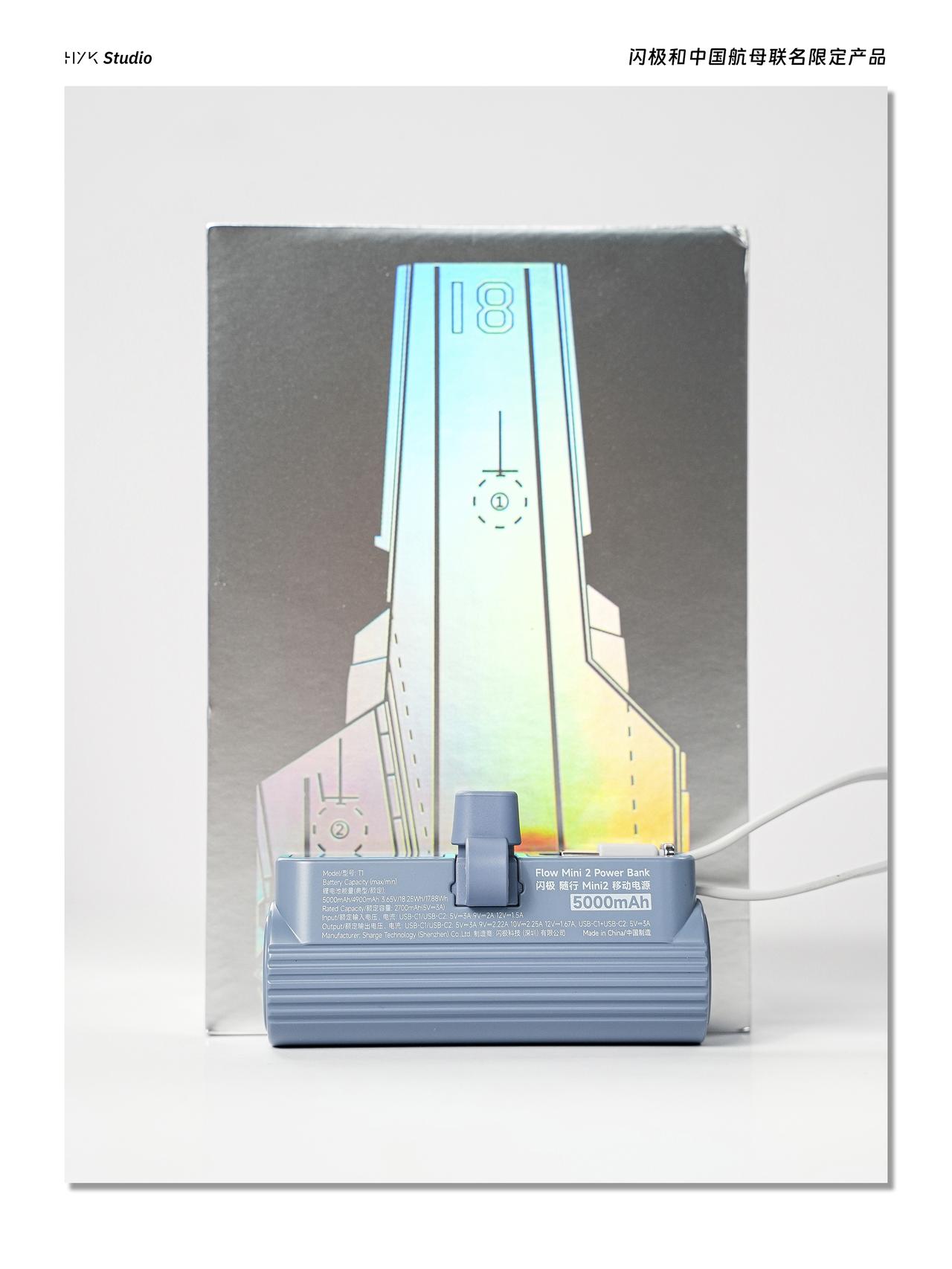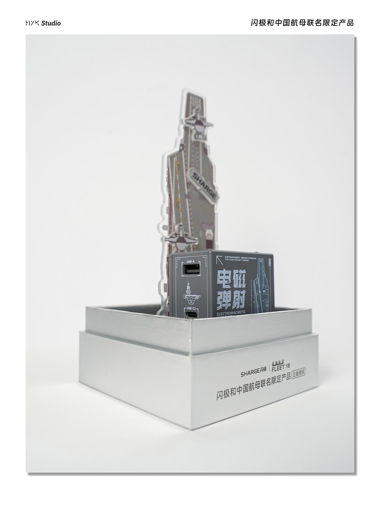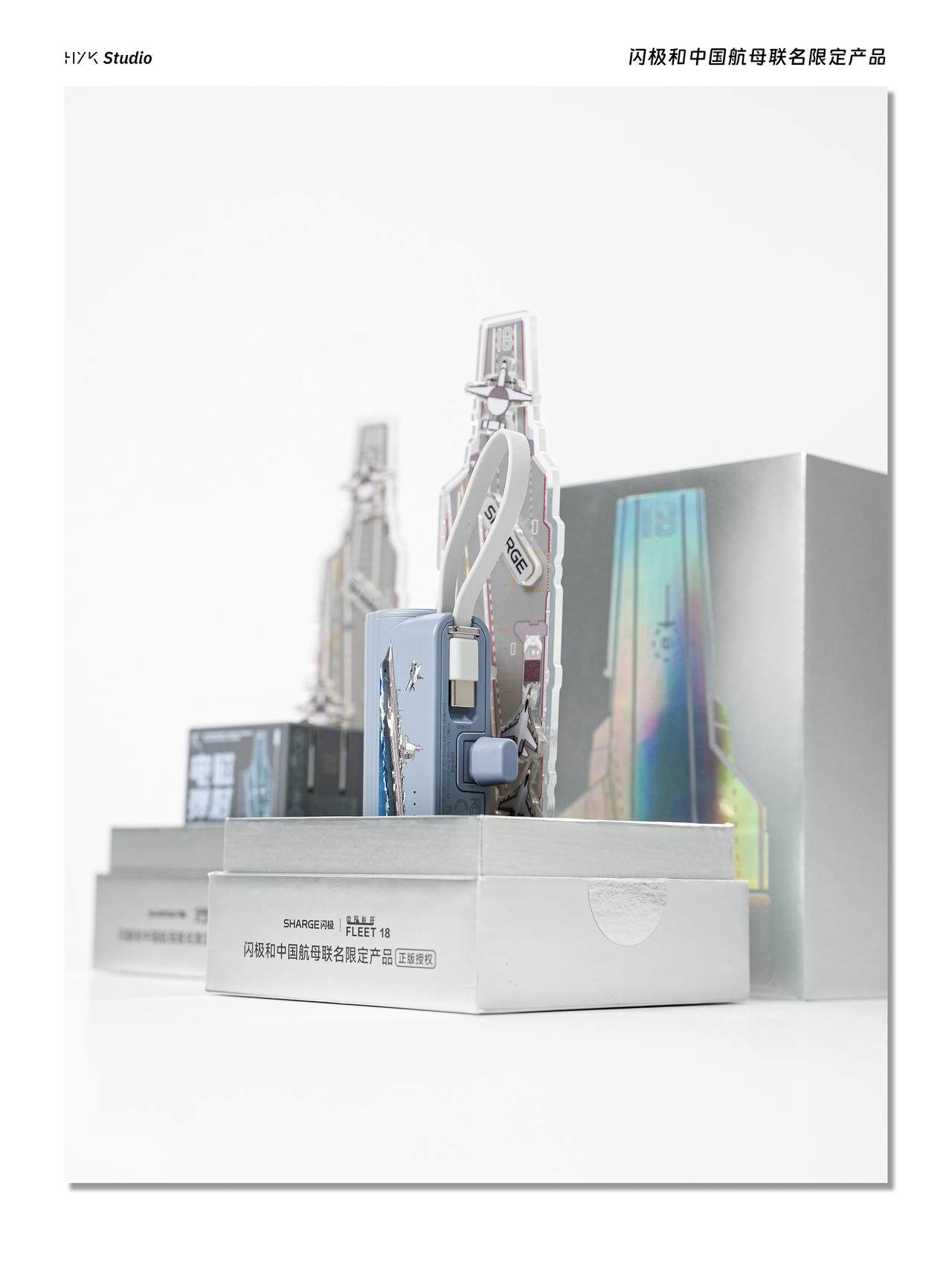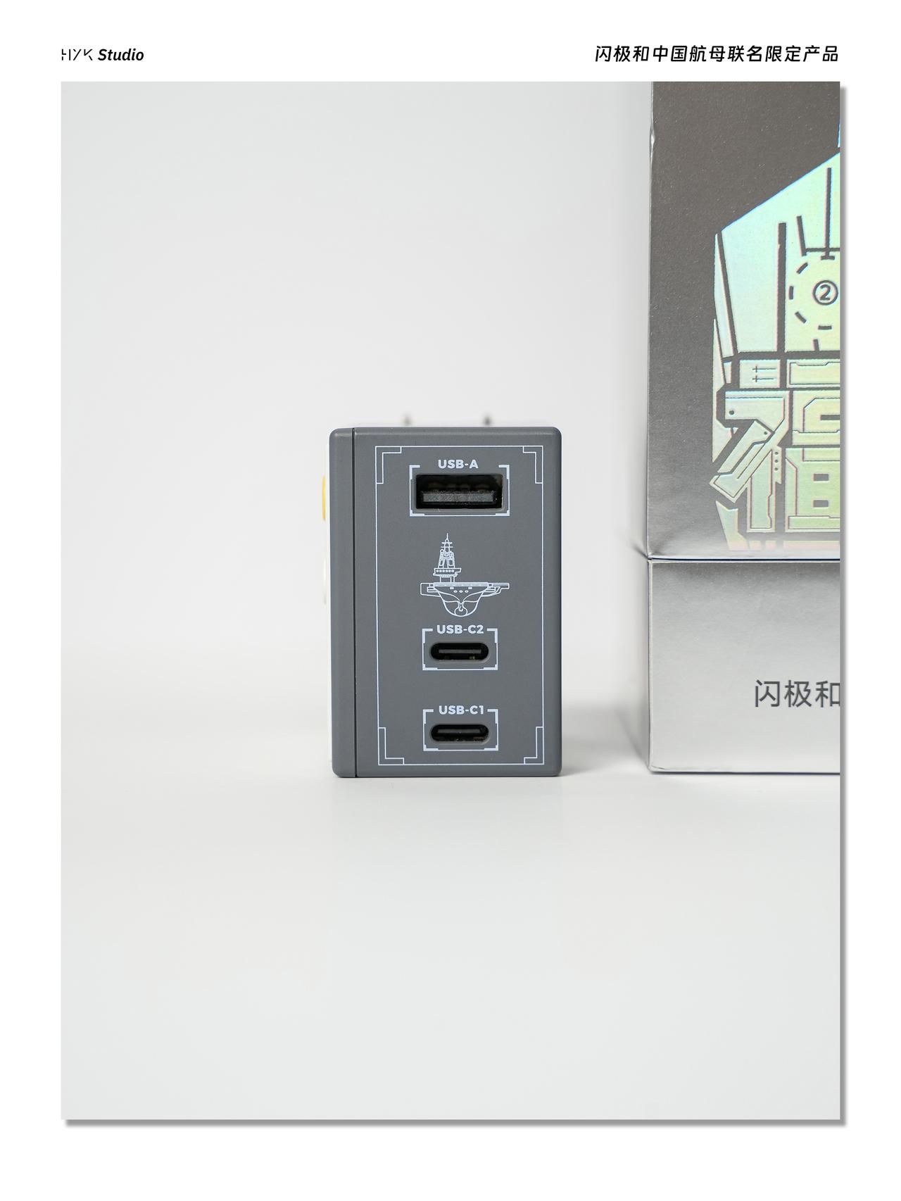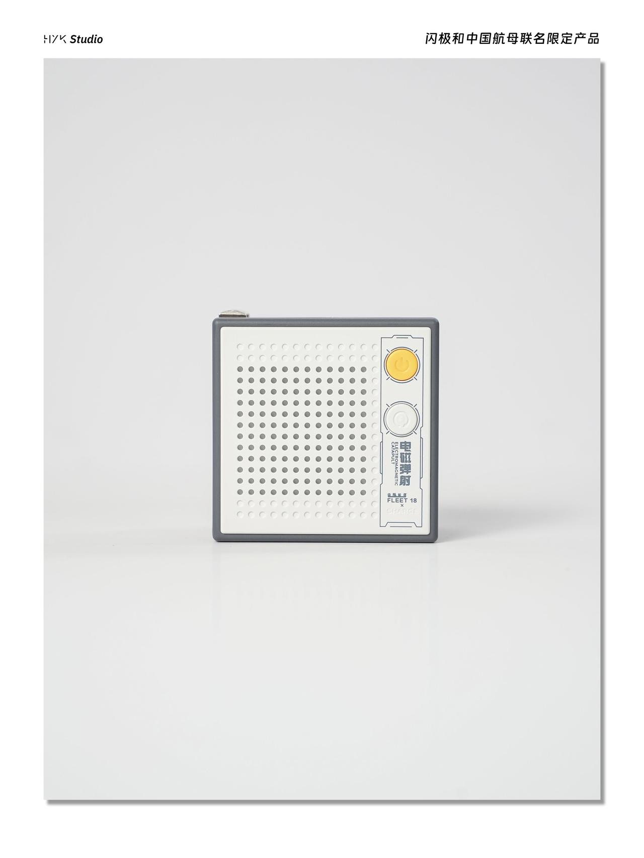 HYK图赏|闪极航母联名套装 「架海擎天」随行移动电源,造型活脱脱一个迷你潜水艇,上面印有中国航母的图片,自带Type-C充电线,上面还有一个Type-C充电口,可以同时给两个设备充电。「相控阵雷达」点阵屏充电器,造型方方正正的,背面印着航母线稿,正面是点阵屏,还有橙白两个调节按键,设计挺有意思的,就算不用当摆件也挺好看的。