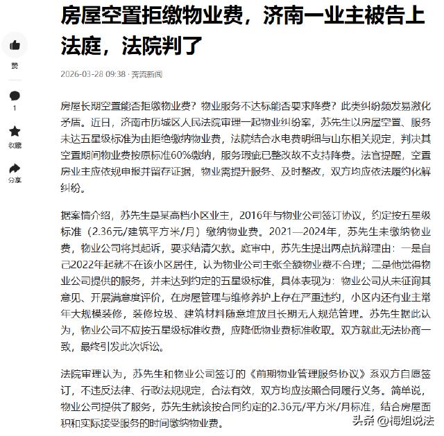 山东,苏先生在一高档小区买了房,签了按五星级标准交物业费的协议。可他觉得物业服务差,根本不值这个价。之后因工作调动搬走后,四年都没交物业费。物业多次催缴无果,最终物业把苏先生告上了法庭,要求补齐4万多元的物业费连本带利。苏先生称搬走后没享受服务,服务也不达标,不该全额交。物业则拿出水电费明细,说苏先生家一直有人住。 苏先生刚搬进这高档小区那会,想着以后能享受五星级的物业服务,住得舒舒服服的。 可住了一段时间,他就发现不对劲了。 小区里装修垃圾乱堆,绿化带里杂草丛生,保安巡逻也不及时,这哪像高档小区,跟普通小区没区别。 苏先生去找物业理论,物业总是敷衍了事,说会尽快处理,可就是不见行动。 2022年,苏先生因为工作调动,不得不搬走,他想着,房子空着了,物业费能少交点或者不交。 毕竟,他都没享受服务了,凭什么还要交钱。 可物业不这么想,物业指出:苏先生虽然搬走了,但房子还是他的,物业费就得照交不误。 于是,他们开始频繁地给苏先生打电话、发短信催缴物业费。 苏先生一开始还耐心解释,说自己没享受服务,不该交全额物业费。 可物业根本不听,还是继续催缴。 时间一长,苏先生也烦了,干脆就不理他们了。 这一拖,就是四年。 四年里,物业费越积越多,已经到了4万多元。 物业见催缴无果,一纸诉状,把苏先生给起诉了。 苏先生觉得自己特别冤,他认为:自己搬走后就没享受过物业服务,凭什么要交全额物业费。 而且,物业的服务根本就不达标,根本不值五星级的标准。 物业还拿出了水电费明细,物业指出,从水电费的使用情况来看,苏先生家一直有人住,根本就不是空置房。 所以,物业费就得全额交。 审理时,法院仔细查看了水电费明细,发现从2022年7月后,苏先生家的用水量确实为零,用电量也大幅减少。 这说明,苏先生家确实有一段时间是空置的。 最后,法院认为,苏先生家空置了近两年半的时间,这期间他确实没享受物业服务,所以物业费可以少交点,交六成就行了。 但是,没有支持苏先生降低物业费标准的要求,因为物业服务合同里已经明确约定了五星级的标准。 苏先生觉得自己没享受服务,就不该交全额物业费,这想法合理吗? 根据《民法典》第944条,业主应当按照约定向物业服务人支付物业费。物业服务人已经按照约定和有关规定提供服务的,业主不得以未接受或者无需接受相关物业服务为由拒绝支付物业费。 苏先生虽然搬走了,但物业服务合同还在有效期内,物业也确实提供了一定的服务。 所以,苏先生不能完全拒绝支付物业费。 但是,考虑到他确实有一段时间没享受服务,法院酌情减少了物业费,这也是合理的。 物业指出苏先生家一直有人住,这能作为全额收取物业费的依据吗? 这也不能一概而论,虽然水电费明细能反映房屋的使用情况,但不能完全证明业主就享受了物业服务。 就像苏先生家,虽然用水用电了,但可能只是偶尔回来住住,大部分时间还是空置的。 所以,物业不能仅凭水电费明细,就要求全额收取物业费。 房子空着的时候,得留好证据,证明自己确实没享受物业服务。 这样,万一跟物业起了纠纷,也能有个说法。 物业也得好好服务,别光想着收钱,不干实事。 不然,业主们可不会买账。
