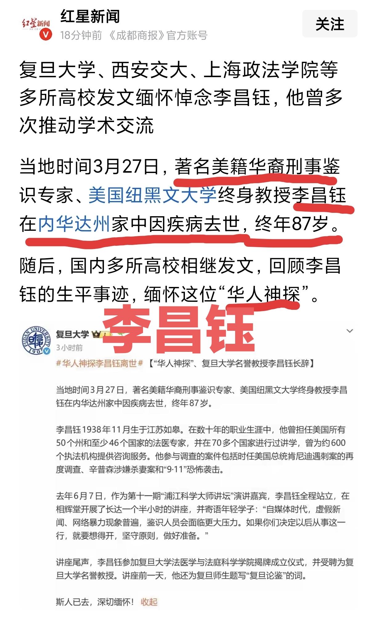 “华人神探”李昌钰近日在美国家中与世长辞,享年87岁。为何众多高校纷纷发文缅怀悼念呢? 包括复旦大学、西安交大、上海政法学院在内的多所高校发文缅怀李昌钰,是由于他多次推动中美两国的学术交流。 自1987年起,他几乎每年都到国内讲学,传授刑事技术领域的新技术、新方法和新经验,且在国内讲课分文不取。 他还在家乡江苏南通如皋捐建了全球首家刑侦科学博物馆——“李昌钰刑侦科学博物馆”,并担任“如皋非遗海外推广大使”。 一个华裔,在异国的司法体系中立足,不依靠关系,不玩噱头,仅凭一台显微镜和逻辑推理,将真相一点点挖掘出来。在他眼中,只有现场物证、痕迹和科学技术,不存在人情世故。 李昌钰博士的伟大之处,首先在于他将科学精神和严谨方法论深深融入刑事鉴识领域。他坚信“让证据说话,对历史负责”,让物证发声,首开以科学证据给嫌犯定罪的先河。在芝加哥炸鸡店杀人案中,一袋毫不起眼的垃圾成了破案的关键。 1959年,他从宝岛的中央警官学校(现中央警察大学)毕业。1965 年,27 岁的李昌钰带赴美留学,两年内拿下了约翰·杰伊学院的刑事科学学士学位。随后他仅用三年时间便完成了纽约大学的硕博连读,拿到了生物化学的博士学位。