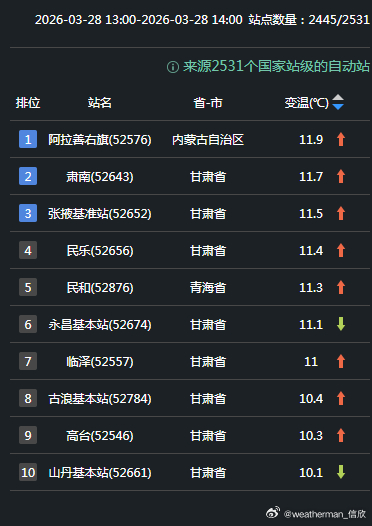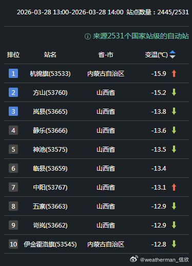 【气温】今天因为冷空气加阴雨,内蒙古河套、陕西北部、山西北部多地出现了10-15℃降温。内蒙古杭锦旗降15.9℃、山西方山降15.2℃,陕西神木降11.5℃,为各自省区14时降温最强站点。而在冷空气过后、天空放晴,甘肃河西走廊和内蒙古西部升温明显,部分站点升幅在10℃以上,包揽了14时升温榜前十。