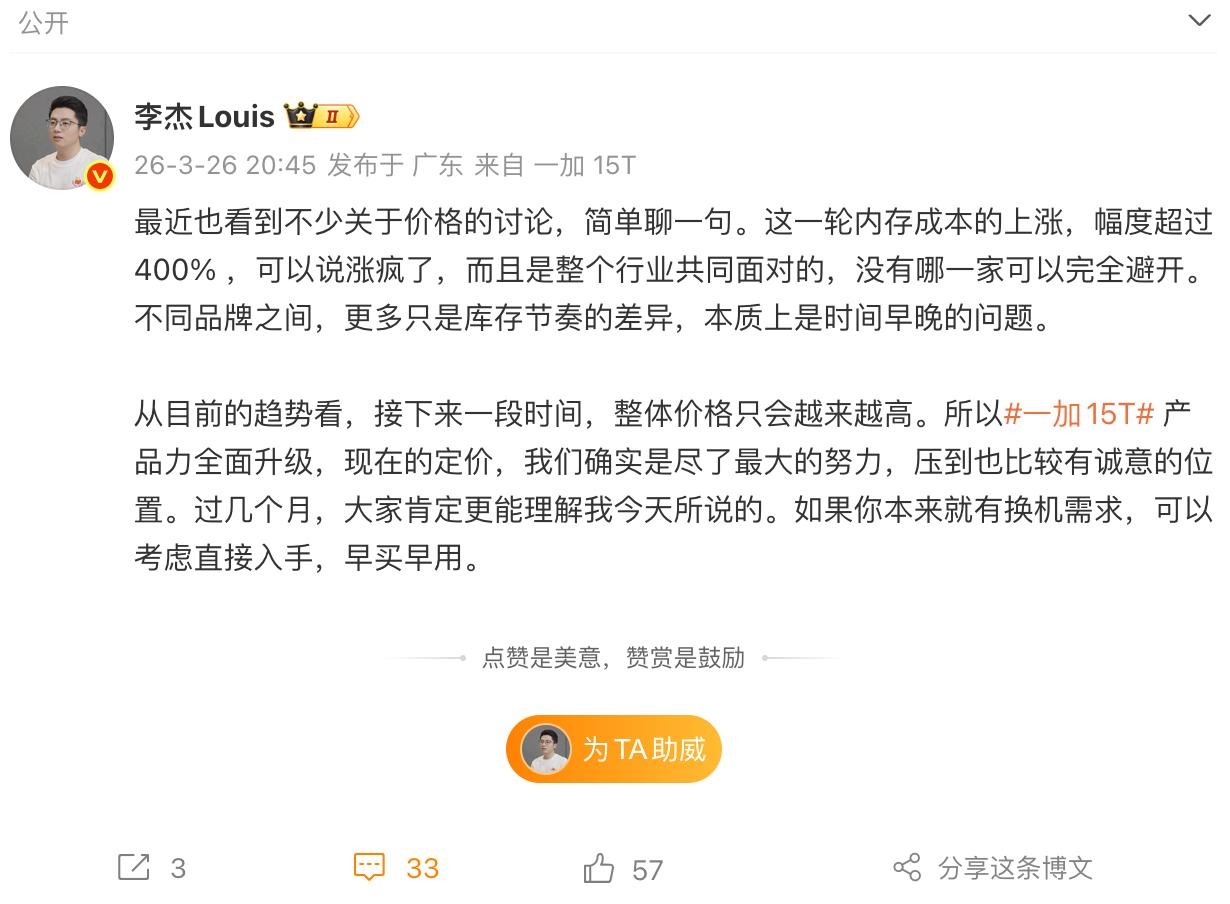 TrendForce上调了2026年4-6月存储价格预测 手机的LPDDR5X内存直接从涨价13~18%跳涨到+58~63%,暴涨45个百分点 想起来一加李杰说的一句话:接下来手机整体价格越来越高