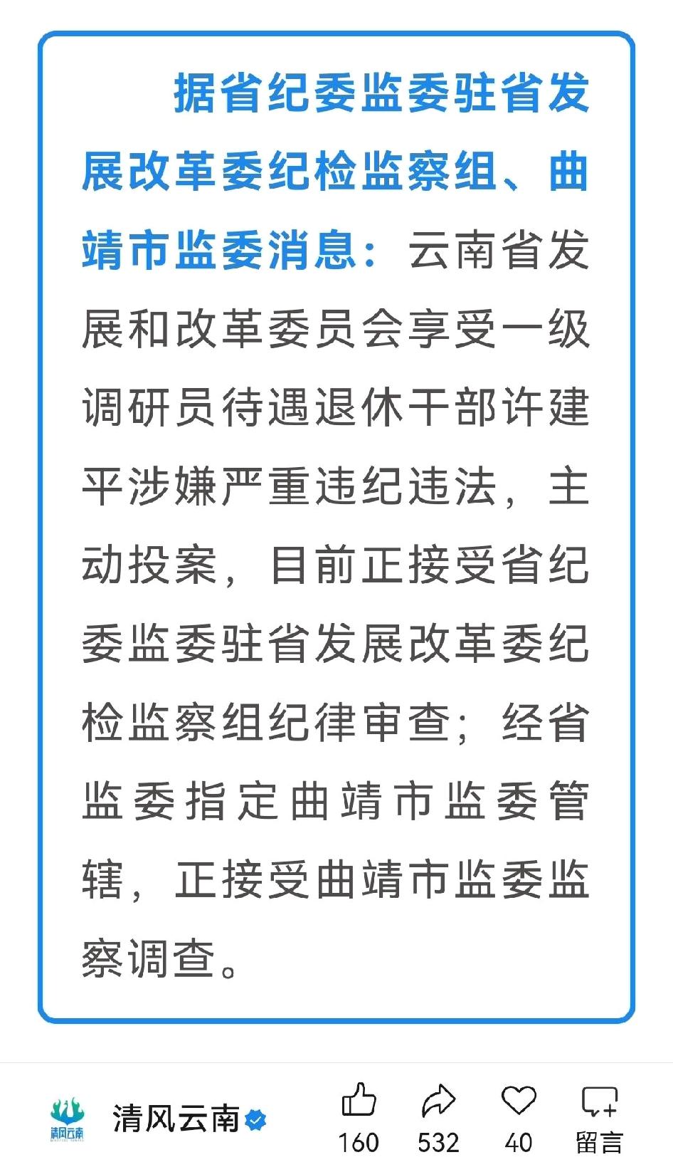 云南省发展和改革委员会享受一级调研员待遇退休干部许建平主动投案,正接受纪律审查和监察调查。 退休了还被查,可见违纪违法这事,逃得了一时逃不了一世。不管什么时候,只要触碰了纪律和法律红线,都别想逍遥法外。这也给在职的公职人员提了个醒,要时刻坚守底线,别以为退休就能万事大吉。 纪律的眼睛一直盯着呢,违法乱纪的行为终将受到应有的惩处。希望这样的案例能起到震慑作用,让公职人员都能廉洁自律。云南 权威发布 一级调研员 退休 昭通违纪违法