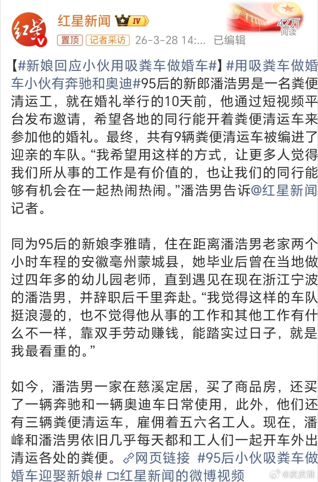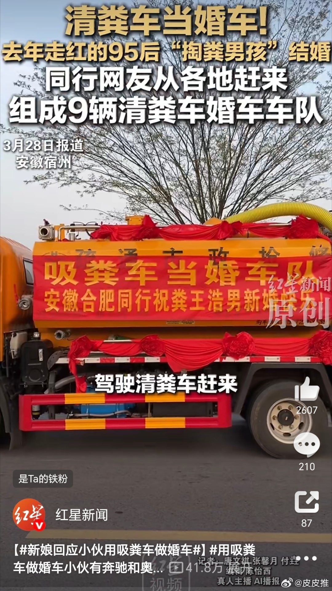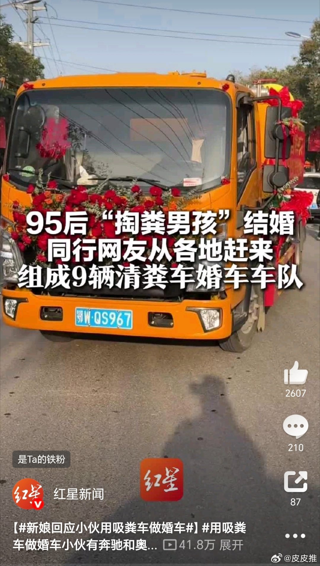 新娘回应小伙用吸粪车做婚车近日,95后小伙结婚用吸粪车做婚车引发了网络热议。
