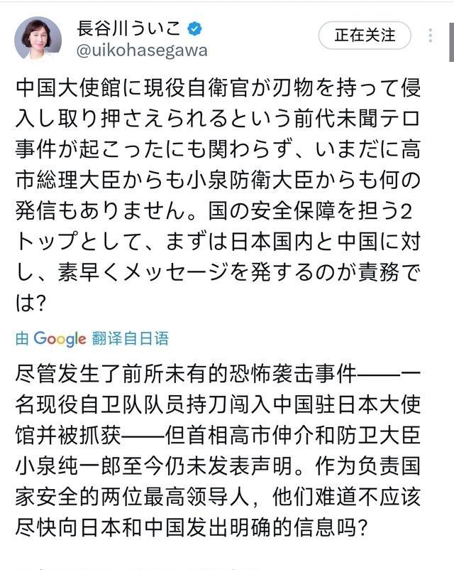 日本政界左翼代表人士长谷川羽衣子3月25日写道;“尽管发生了现役自卫官携带武器闯入中国大使馆并被制服的前所未有的恐怖袭击事件,但迄今为止,高市首相和小泉防卫大臣仍未发表任何声明。作为肩负国家安全保障的两位高层领导人,难道不应当首先向日本国内和中国迅速传达明确的信息吗?” 村田晃大是23岁的陆上自卫队三等陆尉,隶属宫崎县虾野驻屯地。他去年从普通大学毕业,进入陆上自卫队干部候补生学校,今年1月毕业后分配到驻地,3月15日刚升任三等陆尉,属于最低阶干部,负责野战特科相关业务,还没接受专门教育。事发前一天,也就是3月23日,他从驻地请假出发,乘坐高速巴士到福冈博多,再转新干线北上东京,当晚在东京站附近网吧过夜。 24日上午,他到达中国驻日本大使馆周边,在附近转悠约一个小时,找到机会从邻近建筑物的四楼翻越带有铁丝网的围墙进入使馆院内。翻墙时手部被刺铁丝划伤,留下几处割痕。他把刃长约18厘米的刀具放在院内绿化带附近的植栽中,然后走向工作人员区域,声称想见到大使,表达希望中方克制对日强硬言论的意见。使馆工作人员发现后将其控制,没有造成人员受伤。使馆随即通报警方,东京警视厅人员赶到现场,将他以涉嫌非法侵入建筑物逮捕。警方后来在调查中了解到,他供称如果意见不被接受,就打算用刀自尽来制造震惊效果。 长谷川羽衣子在事件发生次日,也就是3月25日发文,直接点出高市早苗和小泉进次郎的沉默。她提到,这两位一位是首相,一位是防卫大臣,肩负国家安全保障重任,在现役自卫官针对外国使馆实施这种行为后,本该迅速向国内民众和中国方面传达明确信息,包括事件经过、处置情况和相关立场。她的质问直指高层在安全事件中的信息传达义务,强调不能让事态因缺乏回应而进一步复杂化。这篇发文很快引起关注,因为它把焦点放在了政府高层的职责上,而不是单纯的事件本身。 高市早苗作为首相,负责国家整体行政和外交决策。小泉进次郎作为防卫大臣,直接管理自卫队,包括人员规范和日常管控。事件发生后,两人初期没有公开表态。直到后来,官房长官木原稔在记者会上表示事件令人遗憾,警方已加强对中国大使馆的警备,包括实施24小时警戒。陆上自卫队方面确认配合警方调查,并在查明事实后严肃处理涉事人员。村田晃大被移送检方,案件进入司法程序。中国外交部发言人表达震惊,向日方提出严正交涉和强烈抗议,指出此举违反维也纳外交关系公约,要求日方彻查并严惩相关人员。 从事实看,这件事暴露了一些管理层面的问题。一个刚升任干部不久的自卫官,能请假后独自行动,千里迢迢从九州到东京,还在当地购买刀具,并在使馆周边观察后翻墙进入,这些细节让外界对自卫队的人员管控和思想教育提出疑问。防卫省后来披露,村田没有特别的问题报告,但事件本身还是引发了对自卫队整体管理的讨论。日本政府通过官方渠道表达遗憾,但初期沉默让部分舆论觉得回应不够及时。长谷川羽衣子的发文正是在这个背景下出现的,她把问题拉回到高层责任上,提醒大家国家安全不是小事,出了问题就得有人站出来说明白。 中日关系本来就面临一些摩擦,这次事件进一步增加了紧张。日方增派警力保护使馆,中国方面也提醒公民注意安全。事件对双边互信有影响,双方都需要通过实际行动来缓和。村田的动机据调查与对中方言论的不满有关,但具体细节还在司法程序中。整个过程显示,外交设施安全是国际通则,任何国家都不能掉以轻心。 政府高层在处理涉外安全事件时,及时、明确的信息传达很重要。沉默不一定解决问题,反而可能让疑问堆积。长谷川羽衣子把这个点挑明,就是希望大家多想想:国家安全出了状况,负责的人该怎么做才算尽到职责?