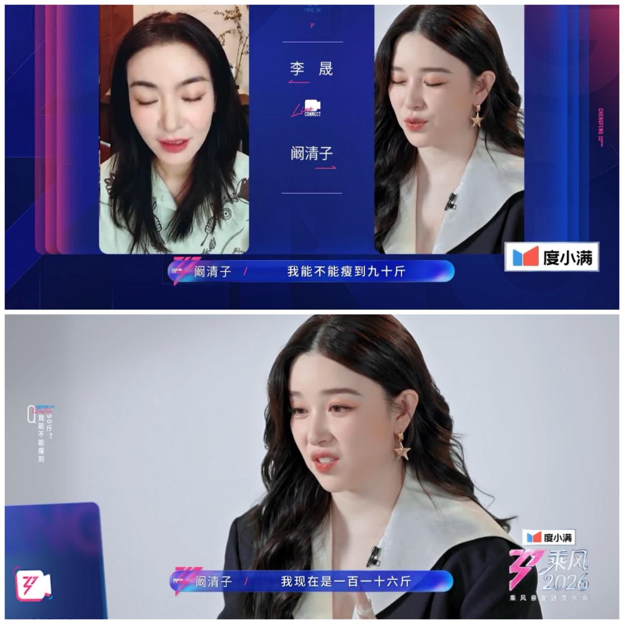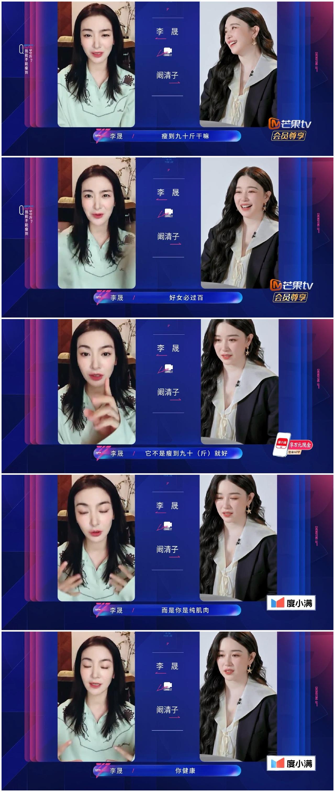 李晟劝说阚清子保持“清醒”, 不要再犯傻, 好好面对现实。 阚清子产后复出, 跟李晟视频闲聊。 阚清子强调自己当下 最大的愿望是减肥减到90斤, 而阚清子当下的体重是116斤。 这样看来阚清子需要减掉26斤, 才可以到目标。 李晟强调好女必过百斤, 不是90斤就好, 关键是健康, 有肌肉。 哎呀, 李晟也是参加过浪姐的人, 虽然浪姐号称减肥训练营, 但是一下子减掉26斤, 李晟应该没有见过, 于是劝说阚清子放弃, 产后需要注意身体, 不要过于劳累, 需要健康减肥。 你说, 阚清子的经纪人是否 忽悠她来浪姐 不但可以赚钱, 还可以减肥呀。 这样看来阚清子会卖力训练的, 不为晋级, 就为了减肥, 也要狠狠练呀。