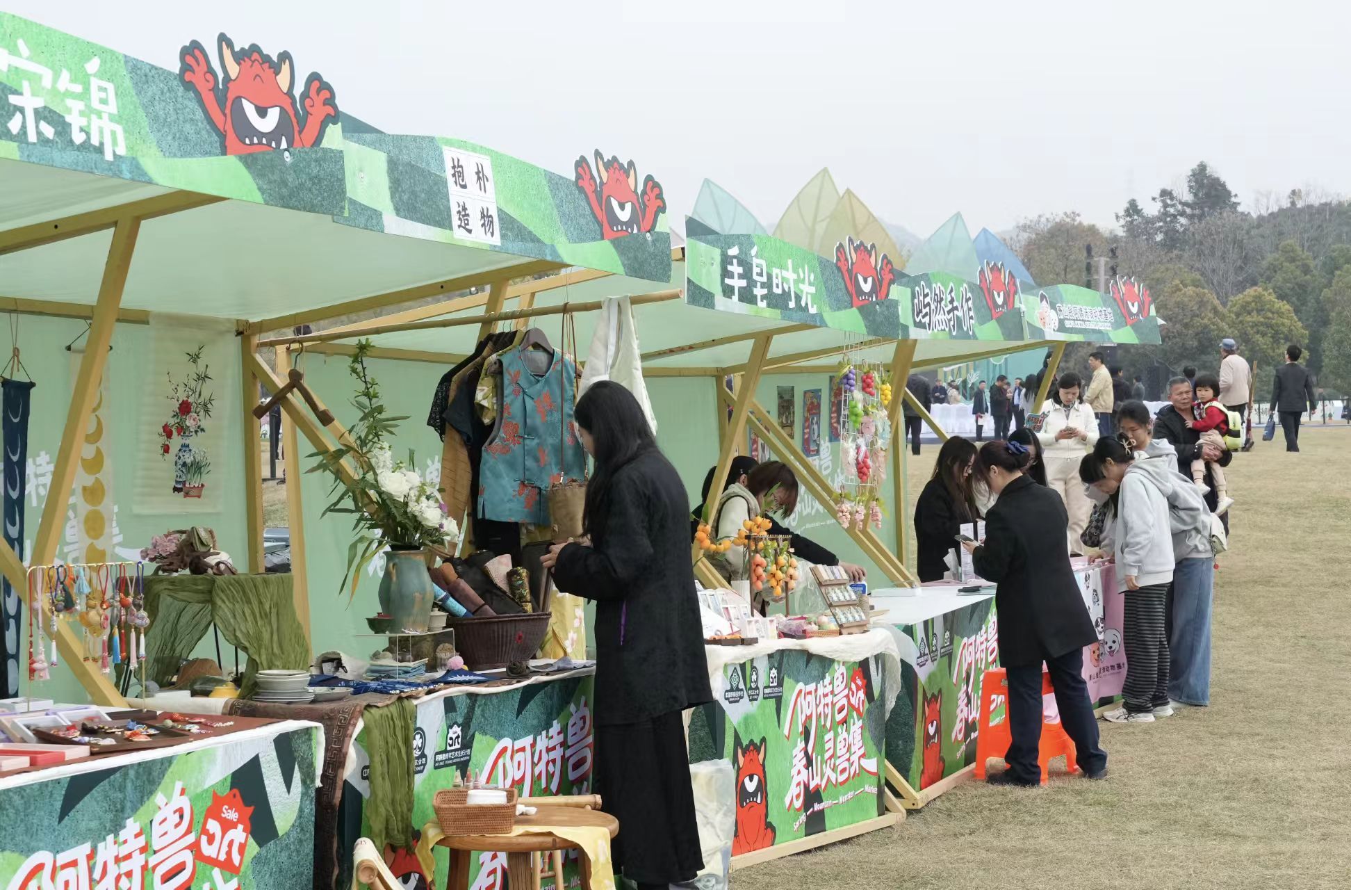 龙坞把中国美院的“阿特兽”艺术市集、浙江音乐学院的草坪音乐会,跟二十位炒茶师傅的现场手艺摆在了一起。茶山脚下,百来个摊位围成一圈,卖茶食、做手作,逛累了看师傅一揉一炒,茶香混着乐声,挺热闹。