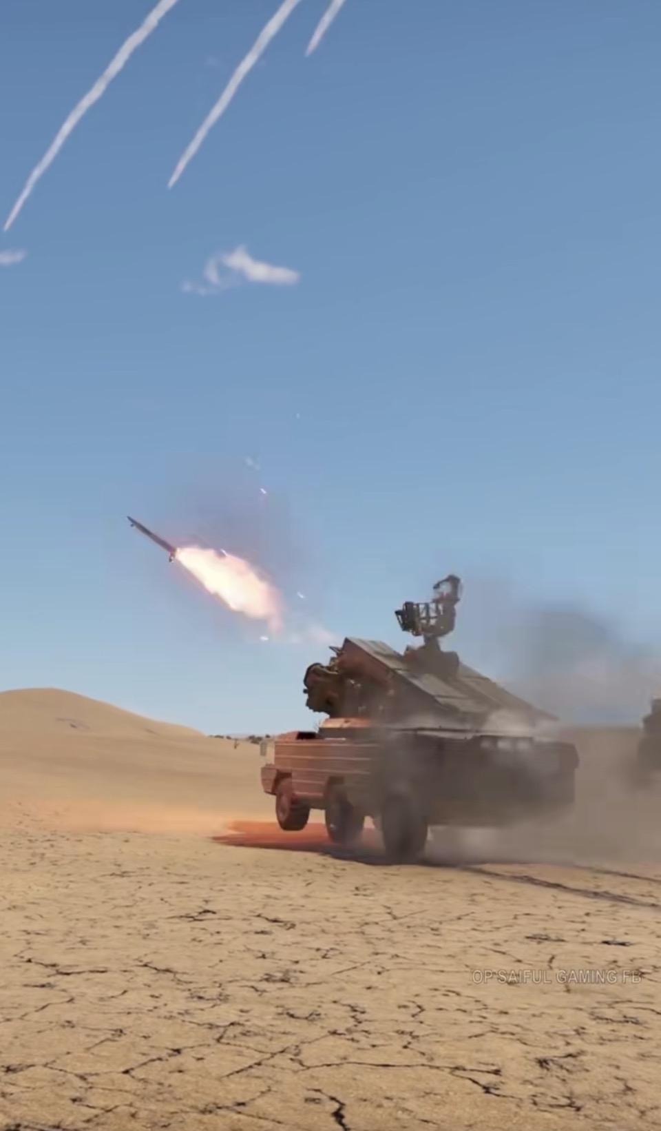 这两张图片展示的是“黄蜂”防空系统在沙漠环境中发射导弹的场景。该系统是一种机动性能极强的防空武器,主要用于打击低空飞行目标,如直升机、无人机和固定翼飞机。从画面中可见,导弹发射时伴随着强烈的火焰和浓烟,背景是晴朗的天空和沙丘地形,突显了该系统在实战环境中的快速反应能力和火力覆盖范围。