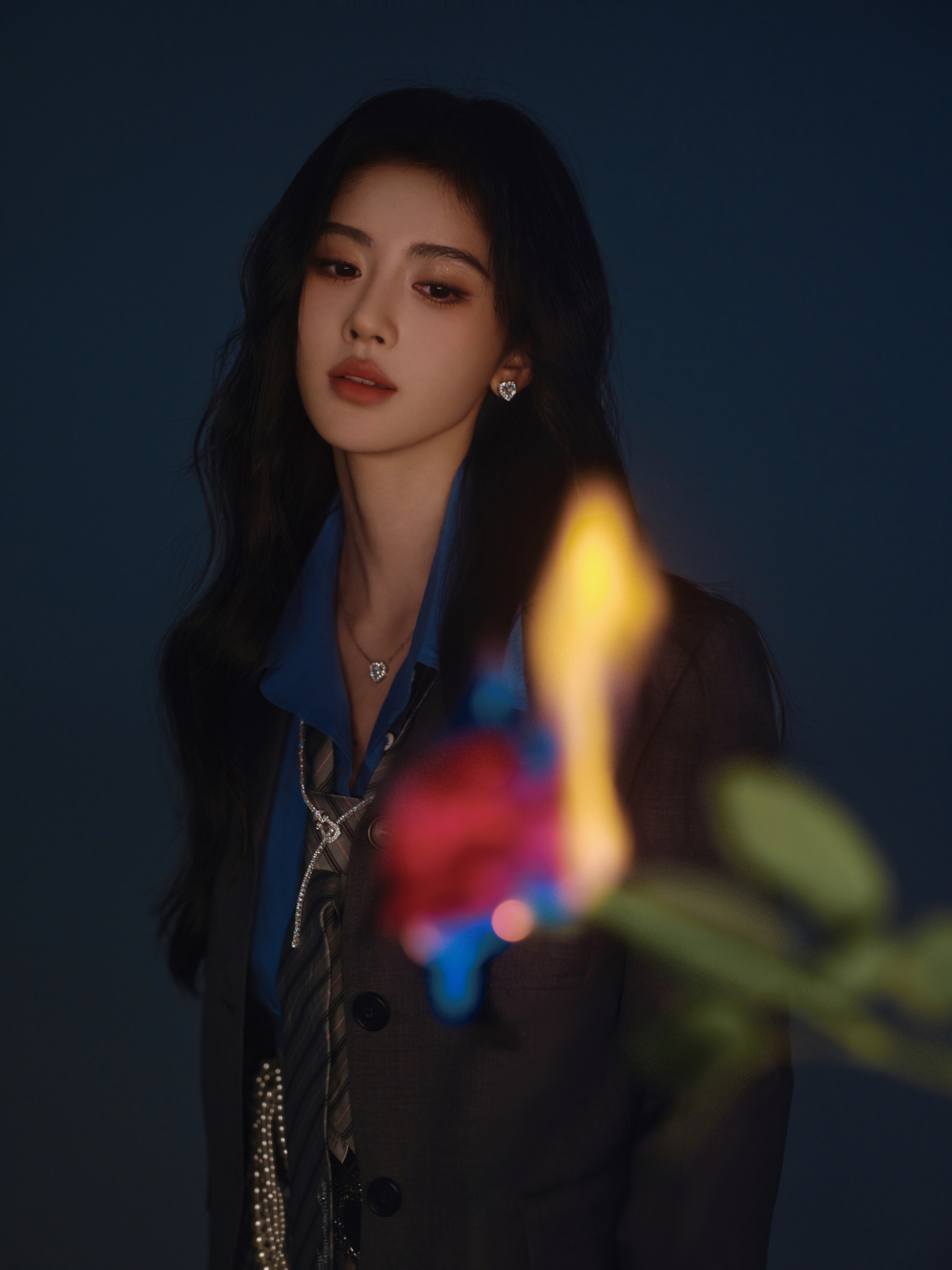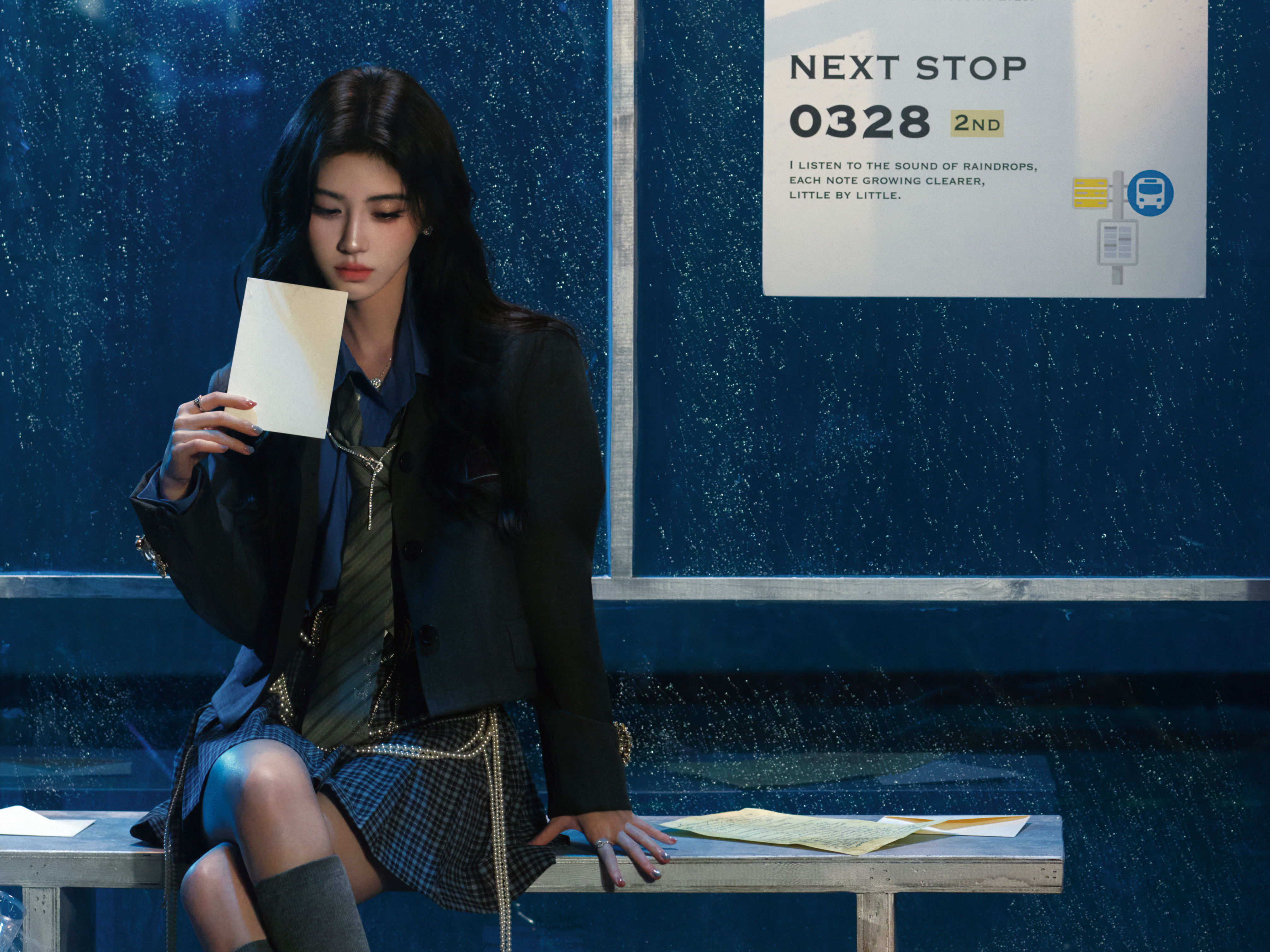 鞠婧祎 × QQ音乐超级巅峰之夜造型大片发布,学院风衬衫与格纹短裙的经典搭配,利落西装外套加持,FRED珠宝点缀,雨夜车站的迷人身影,今日份冷御学姐魅力登场~☂️✨
