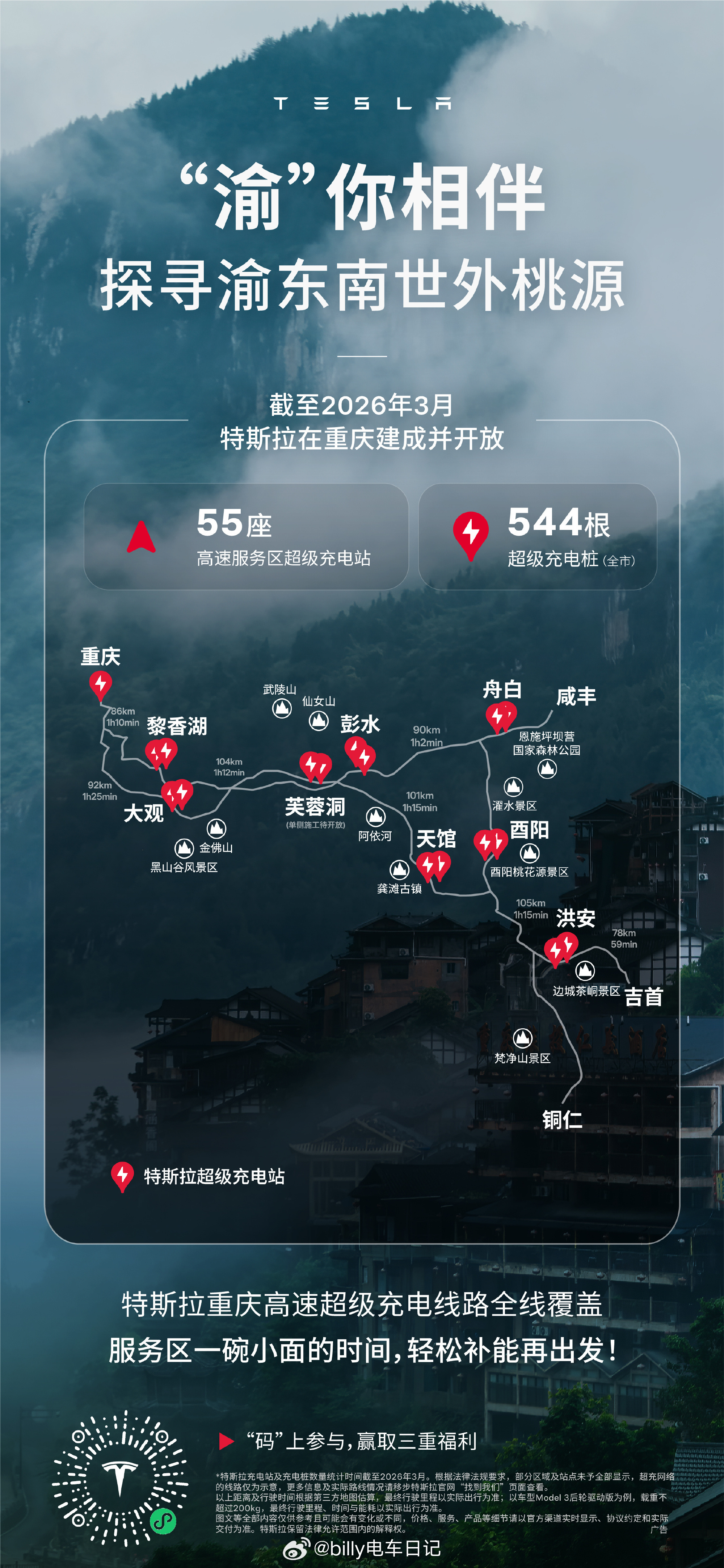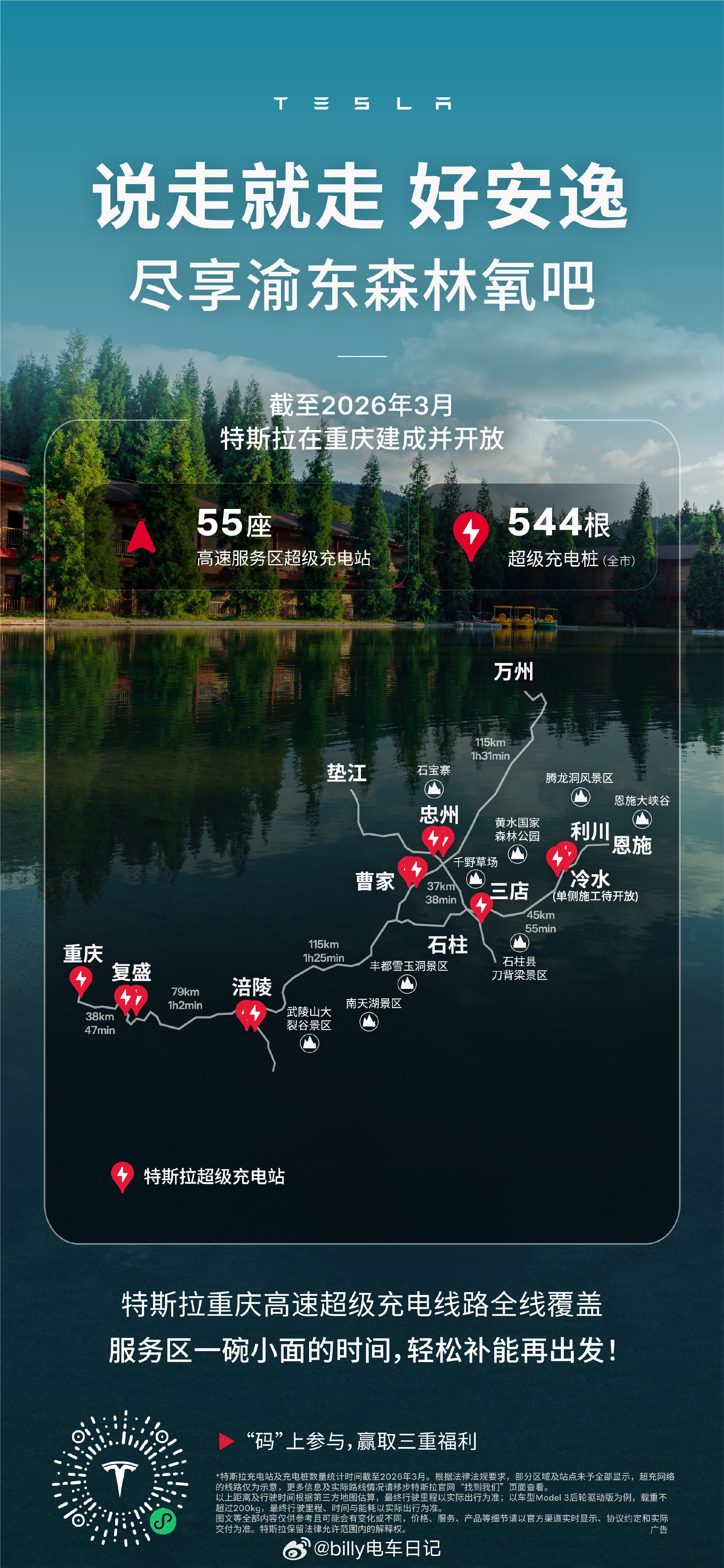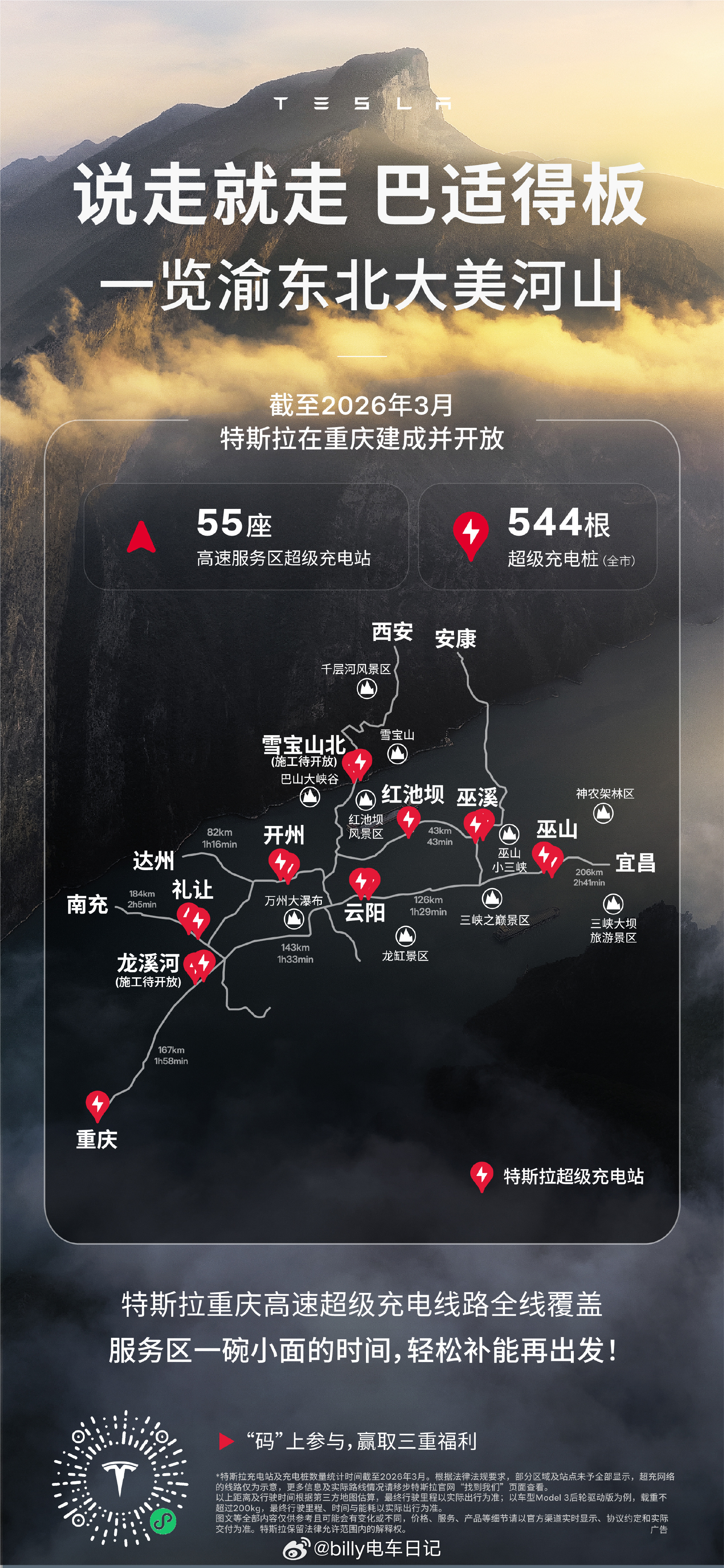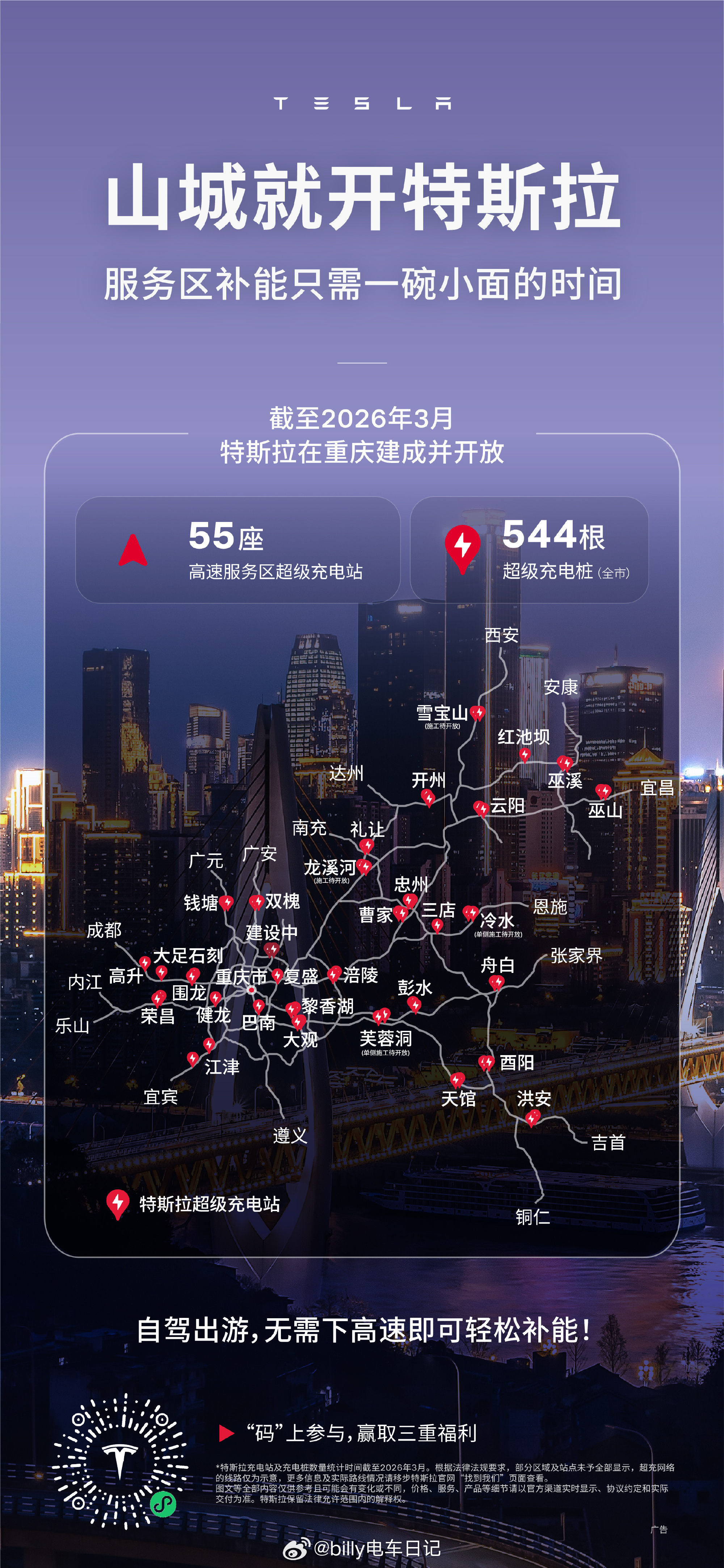 特斯拉也已经布局了高速服务区,而且还是V4超充桩!55座特斯拉超充落地川渝高速,