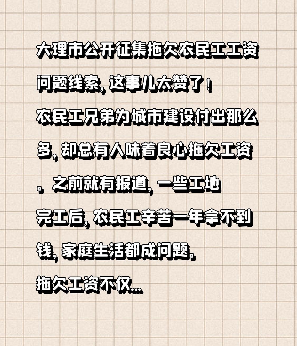 大理市公开征集拖欠农民工工资问题线索,这一举措实在太棒了![击掌][击掌][击掌] 农民工兄弟为城市建设付出诸多心血,可总有一些人丧失良知,拖欠他们的工资。此前便有报道称,部分工地完工后,农民工辛苦劳作一年却拿不到工钱,连家庭生活都成了难题。 拖欠工资的行为,不仅让农民工感到心寒,还会对社会和谐造成影响。大理市此次征集线索,无疑是在为农民工撑腰打气。期望借此能揪出那些黑心老板,让农民工拿到应得的报酬。也盼望着更多地方能够跟进,切实保障劳动者的权益,让每一滴汗水都不会白流。