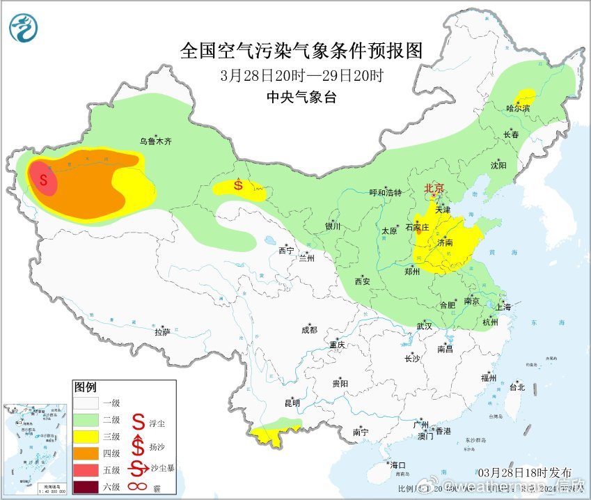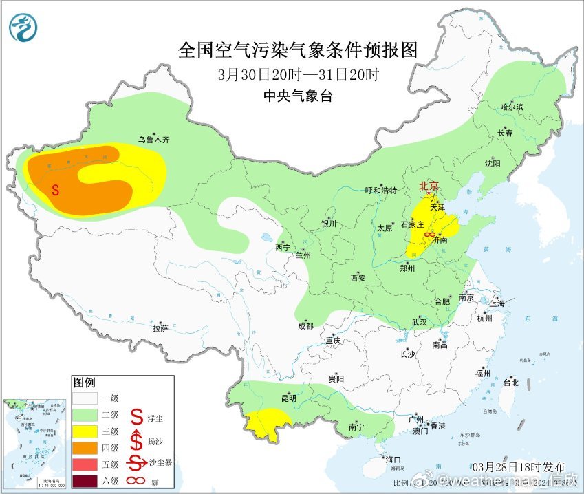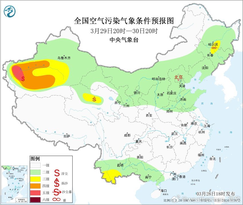 28日夜间至29日白天,华北、黄淮等地大气扩散条件较差,有轻度霾,局地中度霾。29日夜间起,受冷空气影响,霾天气逐渐减弱或消散。受境外传输影响,29日至31日,云南南部的部分地区有轻度霾。另外新疆塔里木盆地依然还有沙尘。