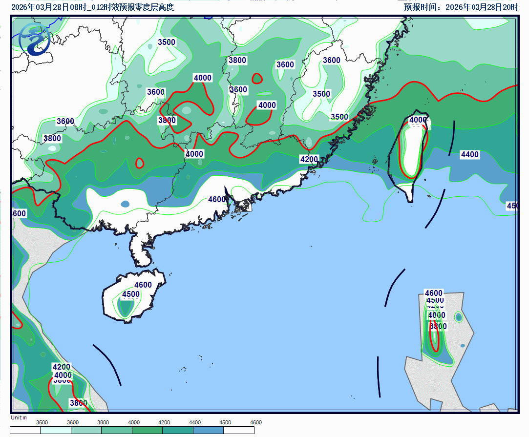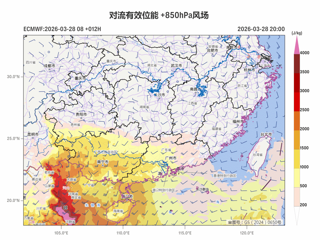 另外在对流层中层,500百帕上有高空槽东移(图7蓝线向下凹陷区),槽底和槽后有干冷空气。与低空850百帕暖湿气流叠加,就会下暖湿、上干冷的不稳定结构,(图8可见对流能量)。这样的配置,就容易导致雷暴大风、冰雹等强对流天气。从0℃层高度预报看,江南华南部分地区在4000米左右,这个高度也是利于形成冰雹的。