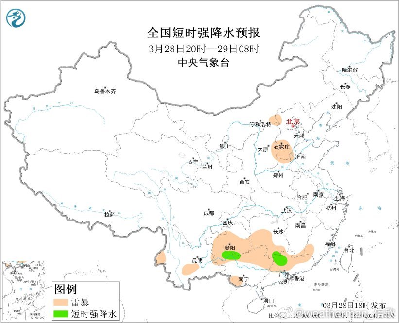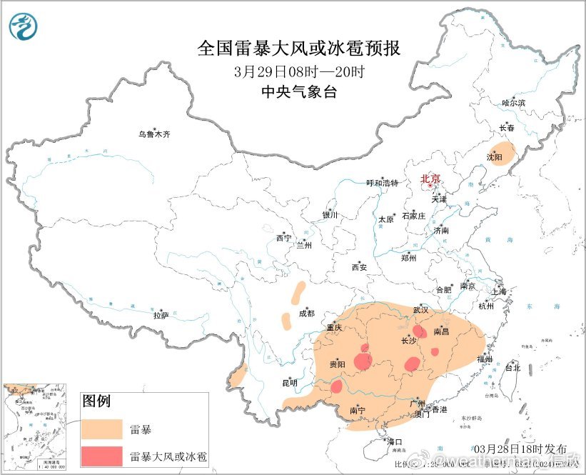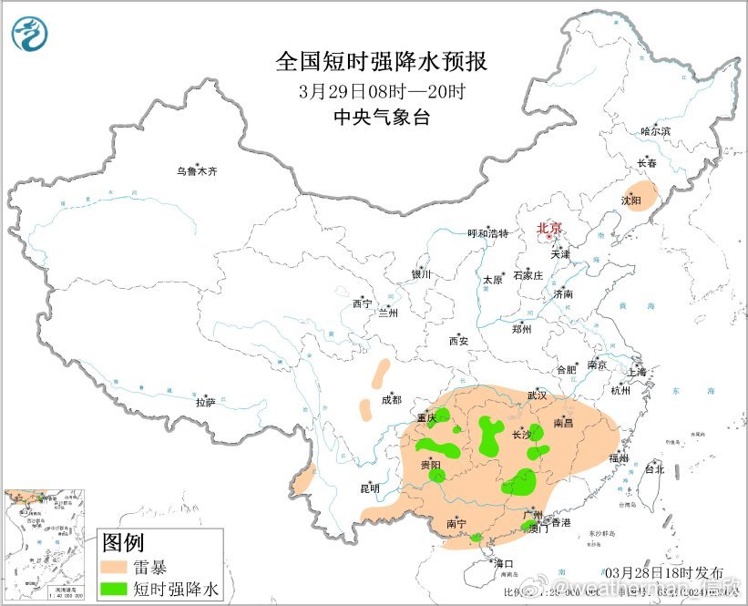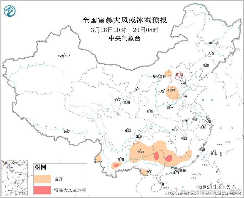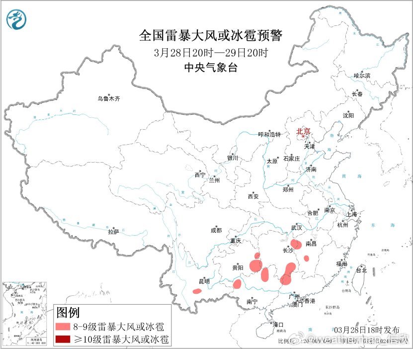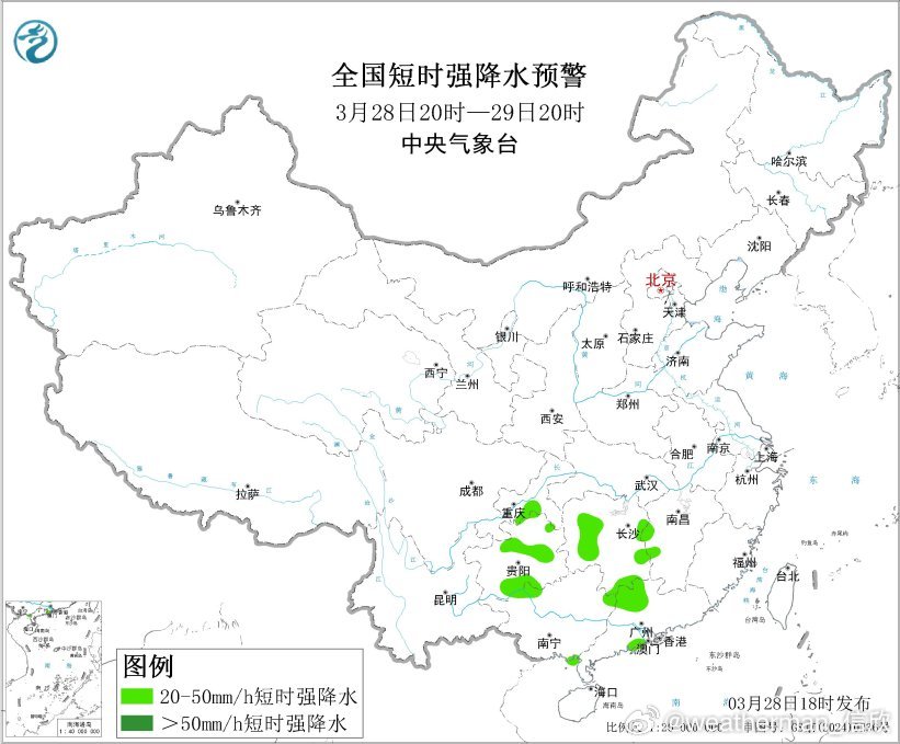 【今年首个强对流预警】今天18时,中央气象台发布了今年首个强对流天气蓝色预警:预计3月28日20时至29日20时,湖南东北部和南部、江西中西部、广西北部和西部、广东西北部、云南中南部、贵州东南部等地的部分地区将有8级以上雷暴大风或冰雹天气;湖南西部和东部、江西西部、广西西北部、广东北部、重庆南部、贵州中南部等地的部分地区将有小时雨量大于20毫米的短时强降水天气。