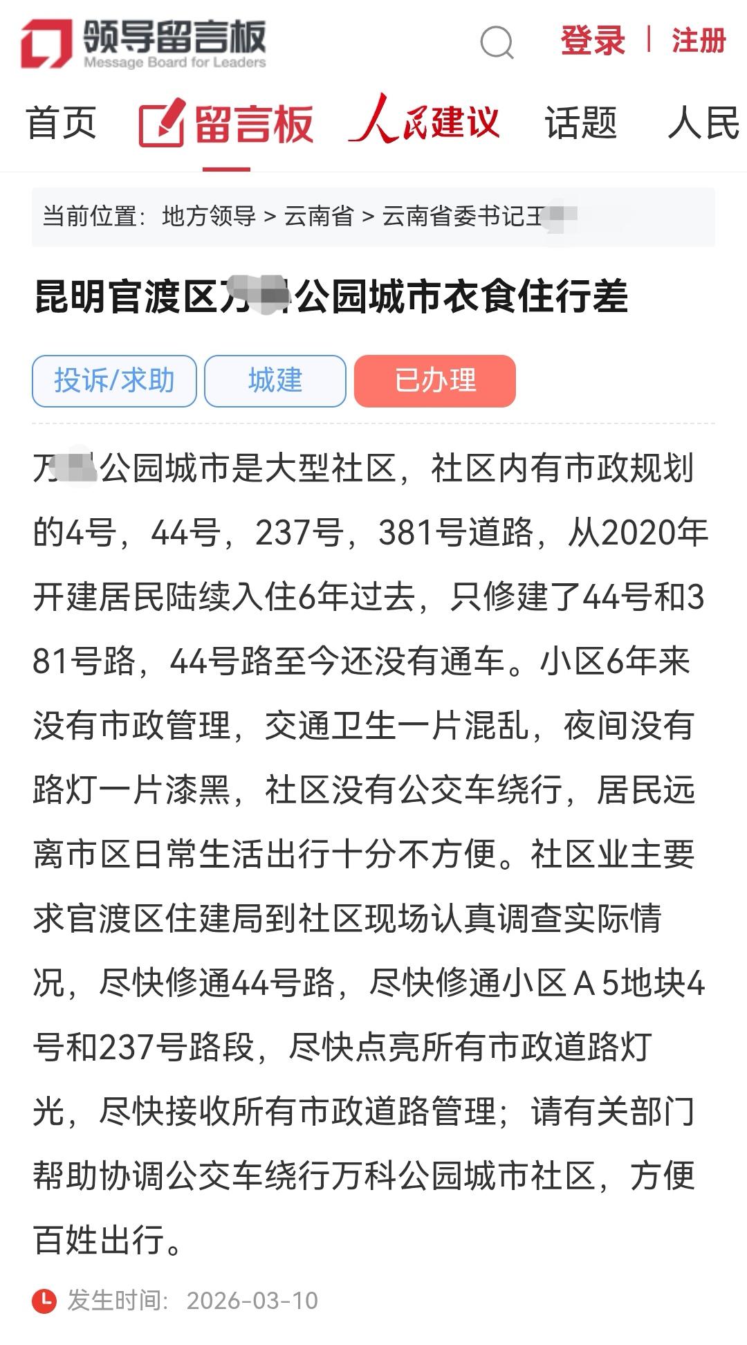 网民向云南省委书记留言投诉昆明官渡区某公园城市衣食住行差 ✍📨📥3月10日网民通过人民网领导留言板给云南省委书记的留言 昆明官渡区XX公园城市衣食住行差 *公园城市是大型社区,社区内有市政规划的4号,44号,237号,381号道路,从2020年开建居民陆续入住6年过去,只修建了44号和381号路,44号路至今还没有通车。小区6年来没有市政管理,交通卫生一片混乱,夜间没有路灯一片漆黑,社区没有公交车绕行,居民远离市区日常生活出行十分不方便。社区业主要求官渡区住建局到社区现场认真调查实际情况,尽快修通44号路,尽快修通小区A5地块4号和237号路段,尽快点亮所有市政道路灯光,尽快接收所有市政道路管理;请有关部门帮助协调公交车绕行万科公园城市社区,方便百姓出行。 发生时间: 2026-03-10 2026-03-23 19:00 官渡区住房和城乡建设局官方回复 网民同志:您好! 您通过人民网领导留言板的留言已收悉,经官渡区住房和城乡建设局认真调查处理,现将有关情况回复如下: XX公园城市周边涉及官渡4号路、官渡237号路、官渡44号路、官渡381号路,官渡4号路和官渡237号路属于总承包项目模式,中X三局作为总承包单位,该项目资金来源于财政统筹,目前该道路受周边地块及资金问题影响处于暂缓实施状态,下一步官渡区住房和城乡建设局将持续督促建设单位筹措建设资金,待建设资金到位后将及时开展道路建设工作,官渡381号路和官渡44号路由万科地产代建,两条道路均处于正常施工状态,待后续道路建设完成且达到移交条件将正常开展移交工作,针对官渡381号路和官渡44号路的路灯问题,地产方正对接相关部门开展亮灯工作,同时官渡区住房和城乡建设局已督促施工单位加快施工进度,道路建设期间给市民带来的不便,还请您谅解。 感谢您的理解与支持,顺祝身体健康、生活愉快! 衣食住行 物业