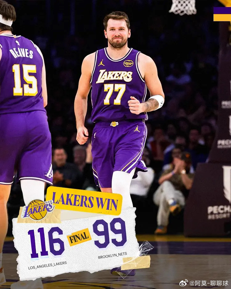湖人送篮网10连败 东契奇41+8下场停赛里夫斯26+8+5NBA常规赛继续进行,洛杉矶湖人队(48胜26负)拿到连胜。东契奇得到41分和8个篮板,里夫斯得到26分、8个篮板和5次助攻,他们带领球队末节打出小高潮确立胜局,湖人队在主场以116-99战胜布鲁克林篮网队(17胜57负)。湖人队拿到2连胜,篮网队遭遇10连败。湖人vs篮网东契奇湖人NBA