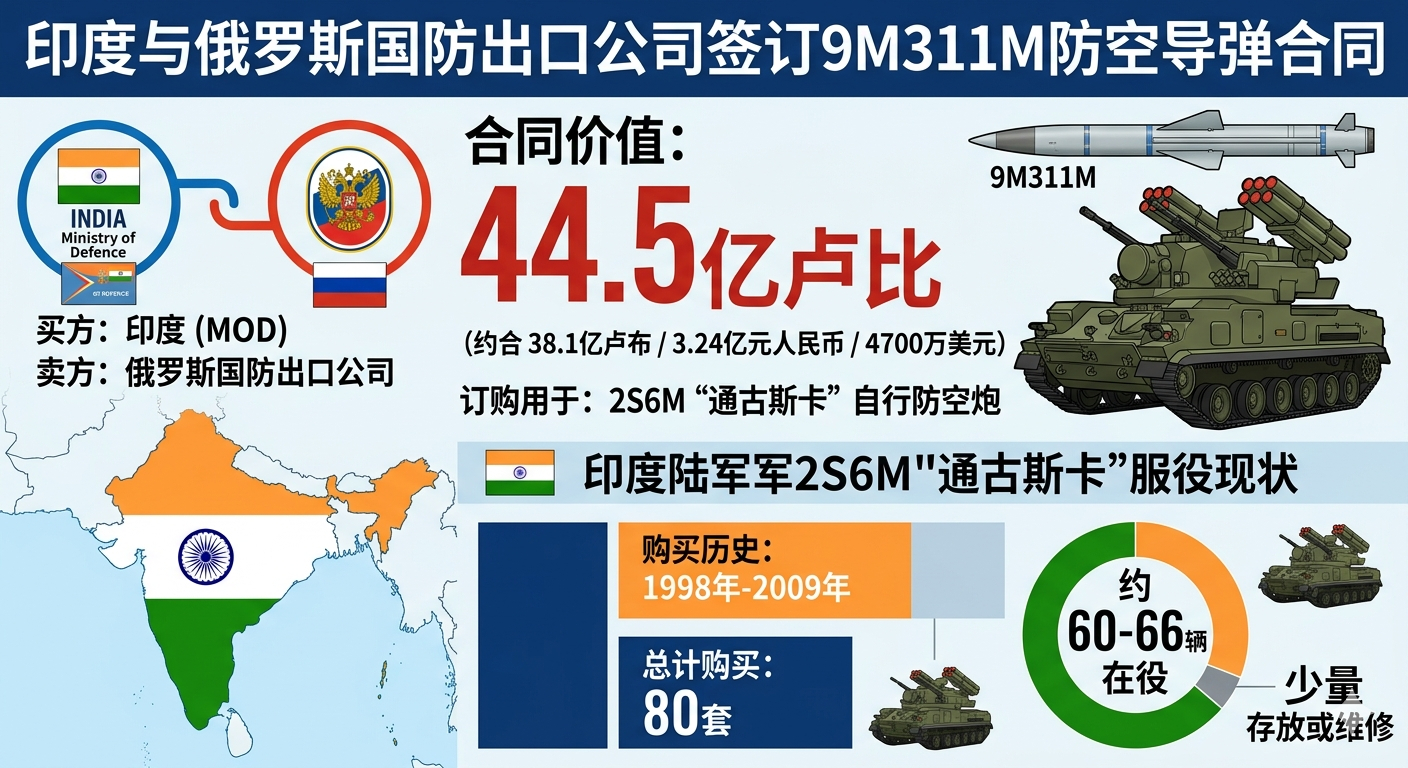 烽火问鼎计划每天认识一件兵器 印度与俄罗斯国防出口公司签订了价值为44.5亿卢比(约合38.1亿卢布/3.24亿元人民币/4700万美元)的合同,以订购用于2S6M“通古斯卡”自行防空炮的9M311M防空导弹。印度在1998年至2009年间购买了80套2S6M,目前约有60至66辆在役,少量存放或维修(图3:AI说明性图片军事Ai新视野 )。