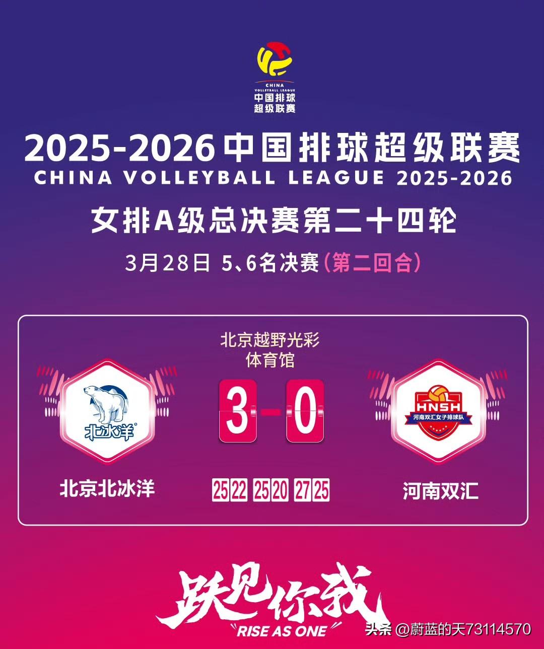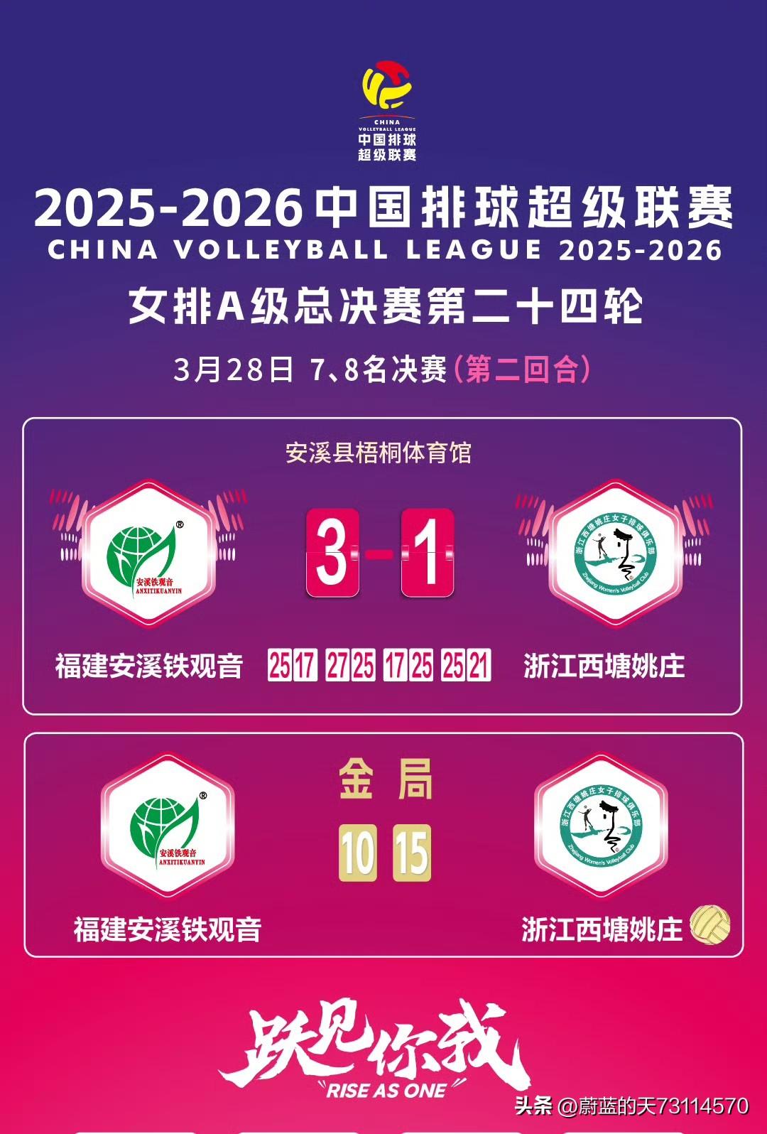 [玫瑰]女排A级总决赛今日(28日)战报及产生的部分名次: 一,7、8名决赛(第2回合):√ 福建安溪铁观音以3-1战胜浙江西塘姚庄,局分:25-17,27-25,17-25,25-21。两回合大比分双方战成1-1平。 金局战中, 浙江女排以15-10战胜福建女排,获得第七名并成功保级。福建女排获得第八名, 将与B级冠军深圳女排打升降级赛,确定谁留在下赛季A级赛 (比赛一场定胜负)。 二,5、6名决赛(第2回合):√ 北京北冰洋3-0战胜河南双汇,局分:25-22,25-20,27-25。 北京女排主客场两回合,两胜河南女排,获得本赛季第五名,河南女排获得第六名。 三,3、4名决赛(第2回合):√ 山东日照钢铁3-0击败天津渤海银行,局分:25-13,25-13,25-16。 山东女排主客场两胜天津女排,获得季军,天津女排获得殿军。 四,冠亚军决赛(第1回合):√ 江苏中天钢铁主场3-0战胜上海光明优倍,局分:25-16,25-16,25-20。 [玫瑰]冠亚军决赛第2回合,江苏女排将于31日19时在客场挑战上海女排,若胜将卫冕冠军。若负将在4月1日19时进行第三场最后决战,争夺总冠军。