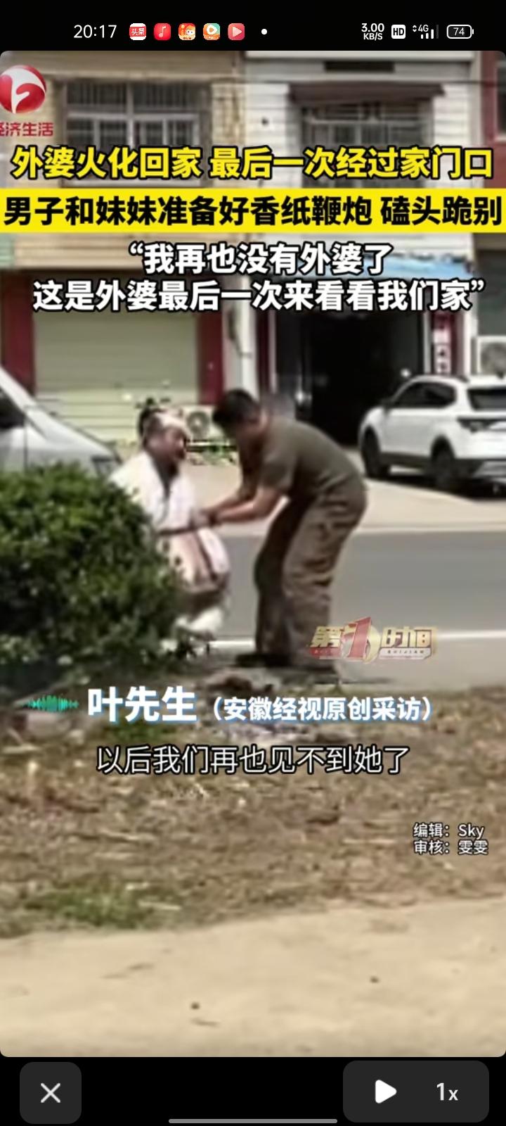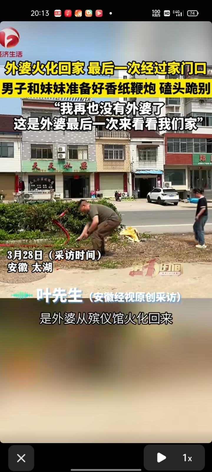 3月27日,安庆市太湖县。叶先生称,外婆从殡仪馆火化回来,最后一次经过家门口。他和妹妹准备好香纸和鞭炮,跪送外婆最后一程。当舅舅披麻戴孝,抱着外婆照片的时候,他们的内心是非常的难受和不舍,这是外婆最后一次来看看他们家,以后再也见不到外婆了。