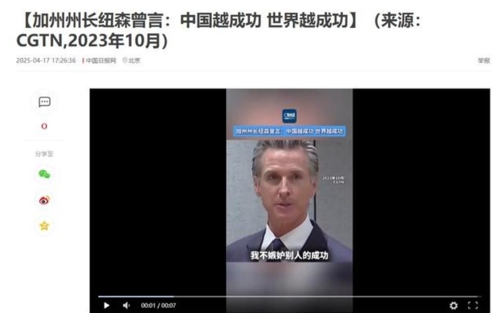 加州州长纽森的一席话最近火遍全网。他直言不讳地劝告某些人,不要眼红中国取得的成功。在他看来,中国越发展,全球才会越繁荣。 麻烦看官老爷们右上角点击一下“关注”,既方便您进行讨论和分享,又能给您带来更多优质的内容,感谢您的支持! 这种表态在当下的外部语境里显得格外清醒,纽森作为美国第一大州的掌门人,心里比谁都清楚,嫉妒挡不住进步,唯有承认彼此成就才能共赢。 这番话背后有着扎实的硬数据支撑,根据国家统计局长期监测,过去四十多年里,中国对世界经济增长的年均贡献率接近百分之二十五。 这意味着咱们不仅是自家发展的排头兵,更是全球经济的稳定锚,尤其在去年全球增速放缓时,咱们百分之五左右的增长给市场注入了强心剂。 纽森敢说大实话,关键因为中国是加州的“钱袋子”,作为全球第四大经济体,加州的科技和农业命脉,其实一直都离不开中国市场的支撑。 就拿硅谷来说,去年卖给中国的芯片和软件获利约八百七十亿美元,这笔巨款不仅养活了无数高薪岗位,更反哺了当地企业的技术迭代研发。 除了高精尖领域,加州中央谷地的果园也离不开咱们,这里出产了全球约八成的杏仁,而中国消费者一直是这些农产品最核心的海外买家。 最让当地农场主感动的是,在特殊困难时期,是中国市场伸出援手,消化了加州近六成的过剩农产品,实实在在帮他们保住了祖传的家业。 这种深度绑定的关系,根本不是几句脱钩的口号就能斩断的,纽森甚至多次公开反对关税壁垒,因为那会让加州白白损失几十亿美元的生意。 他曾明确表示,加州思维和华盛顿完全不同,他更看重实实在在的贸易稳定和民众就业,而不是那种你输我赢、互相拆台的零和博弈游戏。 除了生意经,双方在环境治理上的协作也进入了深水区,加州想要实现减排目标,必须对标中国在新能源和碳捕集技术上的先进经验与产能。 二零二四年五月,双方在伯克利签署了多项气候合作协议,这种技术层面的互补,再次证明了中国的成功其实是给全人类福祉创造新机会。 西海岸的港口群更是中美贸易的晴雨表,从洛杉矶港到长滩港,码头工人和货运司机的生计,都紧紧系在那些往返于大洋两岸的集装箱上。 纽森的呐喊其实拆穿了一个真相,在全球化深入骨髓的今天,中国的发展绝非威胁,而是巨大的机遇,眼红别人的成就,只会让自己变得狭隘。 真正的成功从来不是靠打压对手,而是靠把蛋糕做大,纽森选择从富足的角度看世界,认为合作不是可选项,而是维持本州繁荣的生存题。 中国始终坚持和平发展和互利共赢,加州与咱们多年的经贸往来,就是最好的证明,相互成就、共克时艰,这才是符合人类利益的正确路向。