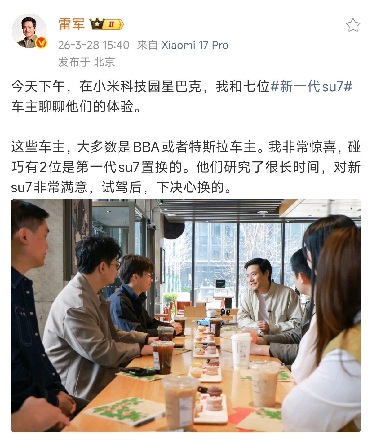 今天雷总和七位新SU7车主在小米园区内的星巴克交流,发现三成以上车主都是从BBA置换过来的。这群人对车的要求本就苛刻,愿意放下豪华车标选择小米,本质上是对产品力的认可。小米新SU7车主很多来自BBA