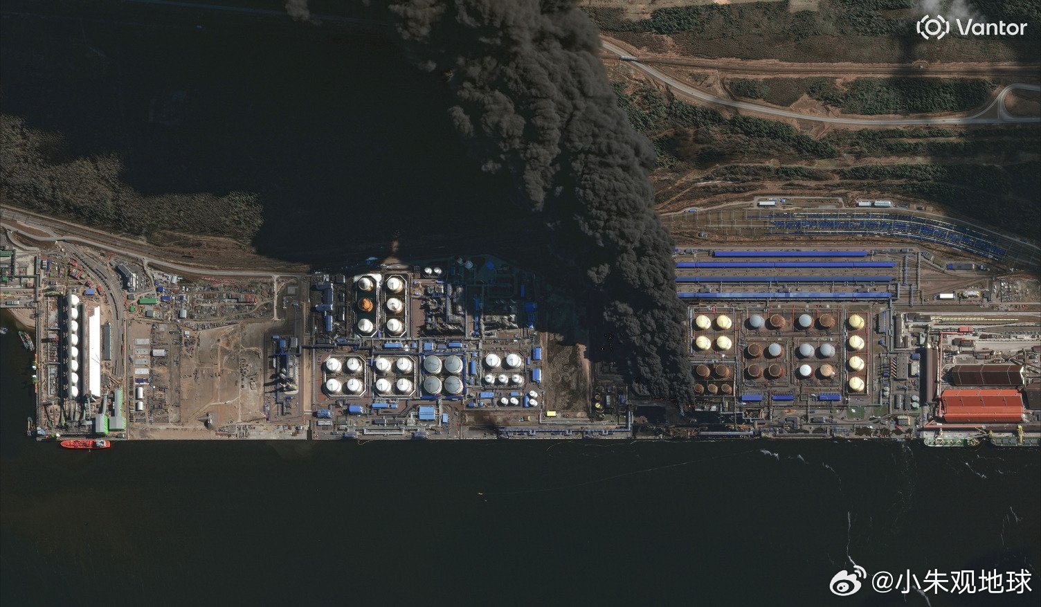 乌克兰无人机袭击俄罗斯列宁格勒地区的乌斯季-卢加石油码头后,冒出滚滚浓烟 俄乌局