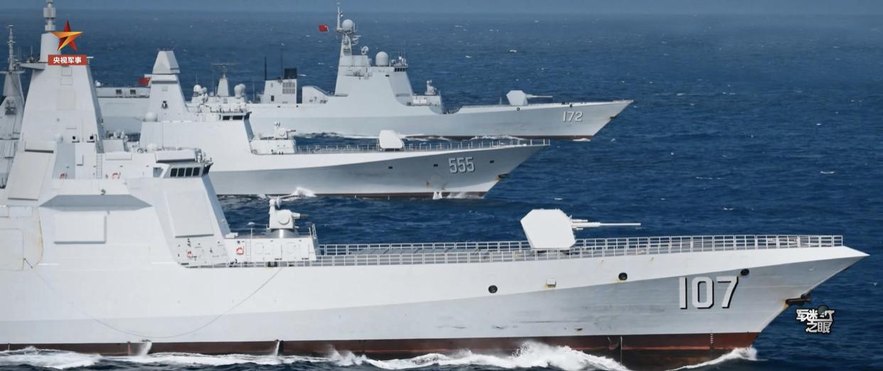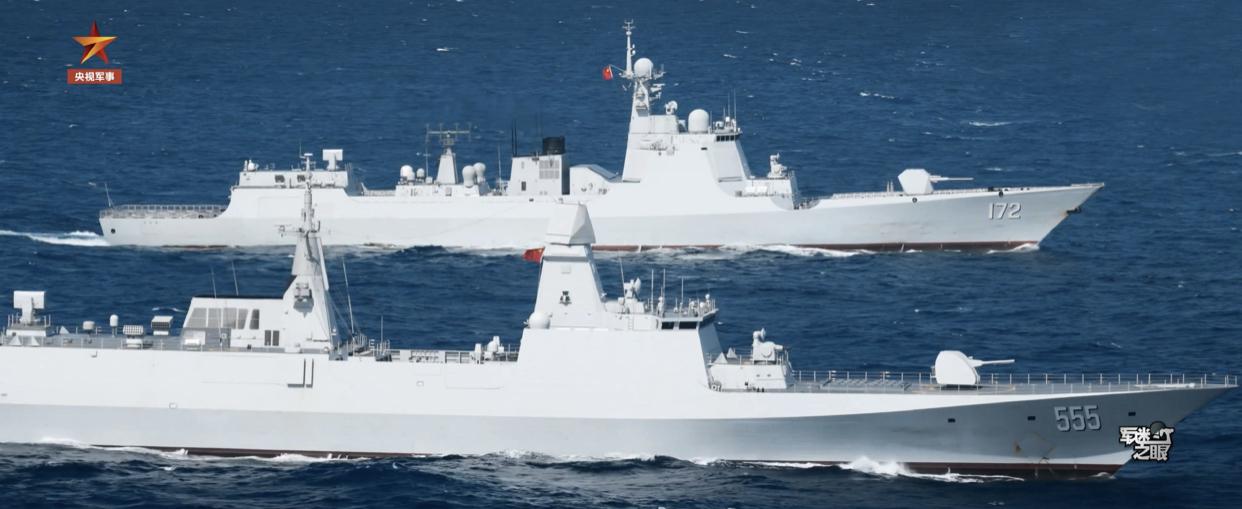 055万吨大驱、052D导弹驱逐舰、054B导弹护卫舰,同框演练画面。