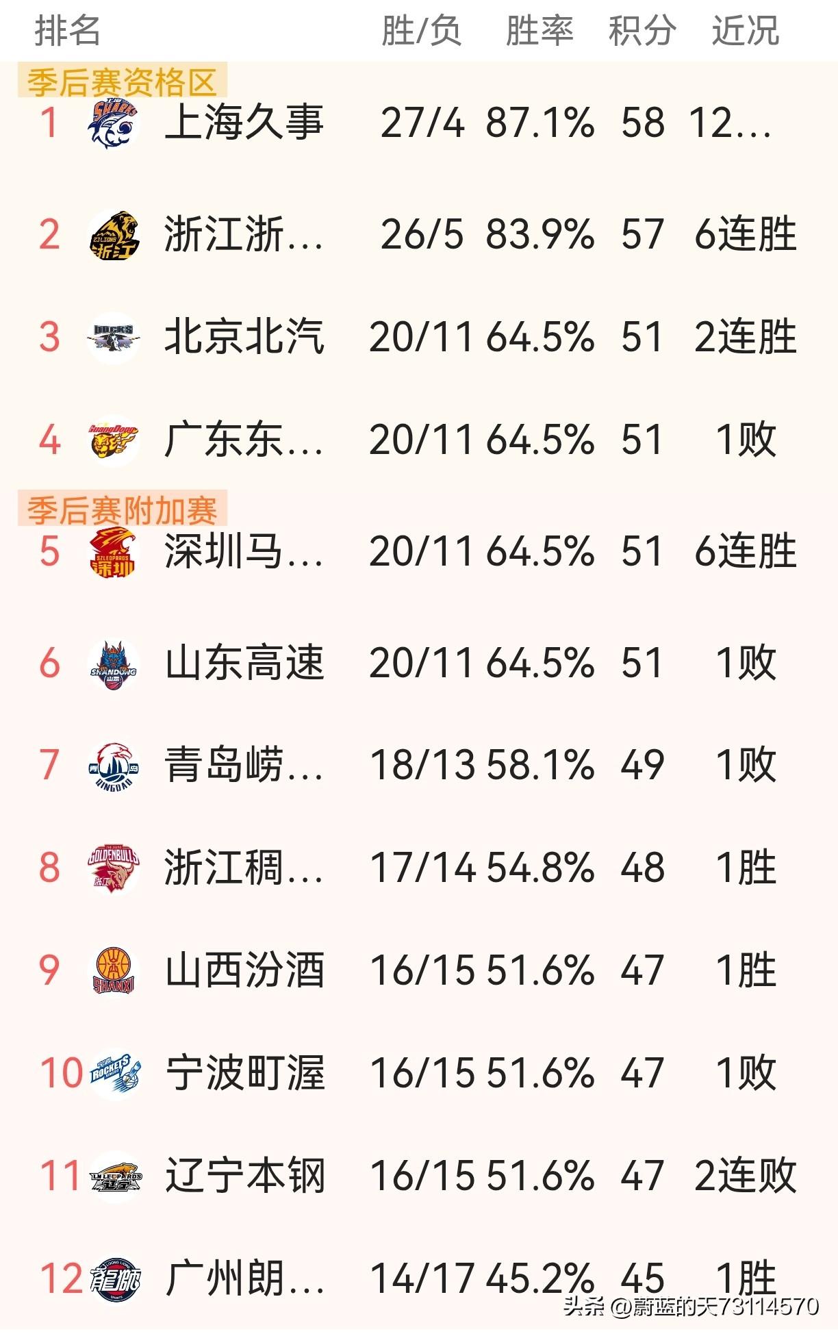 [玫瑰][玫瑰]CBA常规赛第31轮,今结束了四场比赛。 1,北京控股94-78宁波町渥。 2,广州朗肽海本93-77辽宁本钢。 3,青岛崂山啤酒96-100浙江稠州金租。 4,新彊伊力特94-87南京天之蓝。 至此,常规赛第31轮全部战罢(总42轮),还剩十一场比赛。晋级季后赛十二强态势如下: 1,上海久事、浙江广厦、北京北汽、广东东阳光、深圳马可波罗、山东高速,青岛崂山啤酒,浙江稠州金租,这八队已铁定晋级及大概率晋级。 2,山西汾酒股份、 宁波町渥、辽宁本钢,这三支队晋级形势向好,在剩下的十一场比赛,至少要胜四场及以上。 3,广州朗肽海本、北京控股、吉林长白山恩都里,新彊伊力特、福建晋江文旅。这五支队将争夺最后一个晋级名额。 4,南京天之蓝、江苏肯帝亚、天津先行者、四川丰谷酒业,这四支队将无缘晋级。