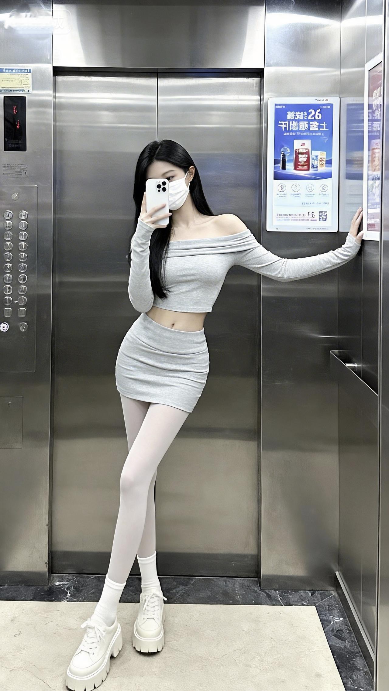 电梯间里,浅灰露肩套装裹着甜酷的松弛,短款设计又藏着辣妹小心机~厚底鞋踩出随性,