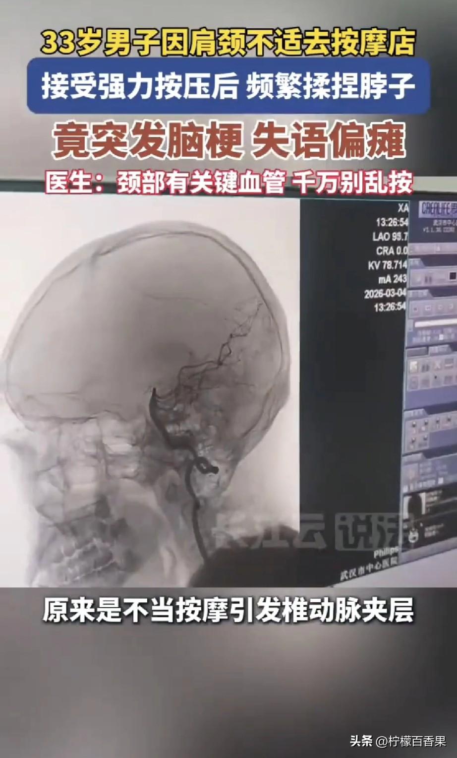 武汉一名33岁男子因肩颈不适去按摩店放松,技师大力按压揉捏脖子后,他在赶飞机途中频繁揉脖子,到机场后直接晕倒送医。 检查结果显示为椎动脉夹层——颈部血管被暴力按压导致内膜撕裂,形成血栓堵塞大脑供血,最终引发脑梗,男子出现失语、半边身子偏瘫的症状,差点丢了命。 医生反复强调:脖子是人体“生命要道”,椎动脉紧贴颈椎,非常脆弱,非专业人士的暴力按压、掰脖子,极易造成血管撕裂,引发中风甚至死亡。肩颈不舒服一定要先去医院检查,选择正规医疗机构的康复治疗,千万别去路边按摩店瞎造!