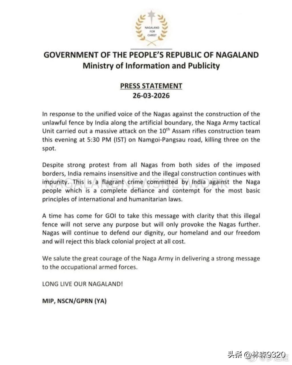 3月26日那加民族武装在藏南击毙三名印度阿萨姆步枪队士兵 据藏南当地媒体报道,当地时间3月26日下午约5:30(印度标准时间),在藏南地区南戈伊-邦绍公路附近发生激烈枪战。事后,那加武装组织NSCN-K(那加民族社会主义委员会的武装派别)发表正式声明称其所属“那加陆军战术部队”当场击毙了三名印度阿萨姆步枪队士兵,他们的目标是负责印缅边境围栏项目安保的印军队伍。不过印度安全部队随后发表声明“证实”,伏击发生在印缅172-173号边界柱附近,但他们否认了三名印军死亡的说法,只承认有一名名为拉维·库马尔的印军士兵受伤,并被送往医院接受治疗。印度阿萨姆步枪队是印度内政部所属的几支警察和边防部队之一,在印度内政部推行“一边一兵”政策后,阿萨姆步枪队被解除了中印边境地区的边防任务,专注于印缅边境的边防。目前阿萨姆步枪队下辖三个总队,12个支队,全部部署在印度东北部地区。
