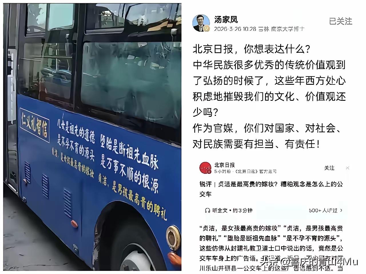 公交车贴“女子贞洁”标语吵翻全网! 反对就等于支持淫荡?太窒息 活久见!都2026年了,公交车上居然还能贴出这种标语,看完一肚子火! 一句“女子以贞洁为贤德”,把全网都炸懵了,男女网友吵得不可开交! 反对就被骂不守妇道,这种道德绑架,凭什么绑架现代人? 这事发生在四川乐山井研县的公交车上,标语写着“男子有妇女儿女,不可以贪心奢欲;女子以贞洁名良善贤德”,刚曝光就引发轩然大波。妇女报、北京日报接连发声,直指这是封建糟粕,是对女性的刻板歧视,完全违背男女平等的现代理念。 可偏偏有不少人觉得这话没毛病,说提倡贞洁是传统美德,还反过来骂提出异议的人,张口就是“反对贞洁,就是想伤风败俗”“不认可这个,就是支持歪风邪气”,扣帽子的话难听又离谱。 明明大家反对的是把女性捆绑在“贞洁”标签上,反对的是这种陈旧的性别歧视,从来不是否定自尊自爱,可偏偏有人故意混淆概念,用封建思想绑架所有人。 公共交通是面向所有人的空间,本该传递平等包容的观念,反倒搬出老旧说辞,难怪无数人觉得憋屈又气愤。尤其是女性朋友,看到这样的标语,心里更是五味杂陈。 到底什么才是真正的传统美德?这种歧视性标语,真的该出现在公共场合吗?
