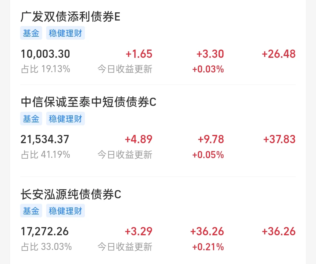 最近闲着无聊,开了一个小号放了5万,专门存纯债里面,总体来说,我感觉这个收益要比直接放余额宝,多挺多的,重点非常稳耶!