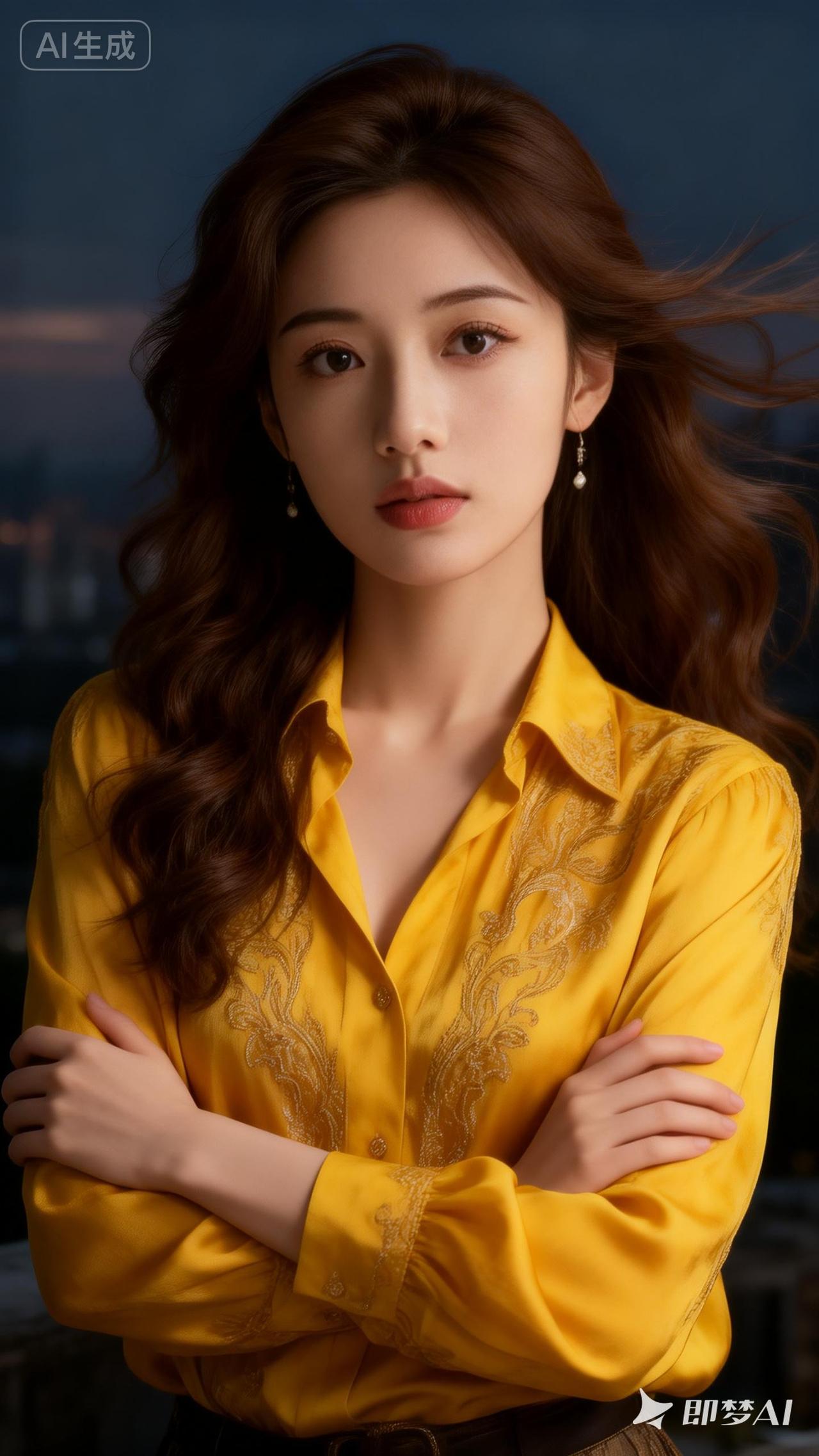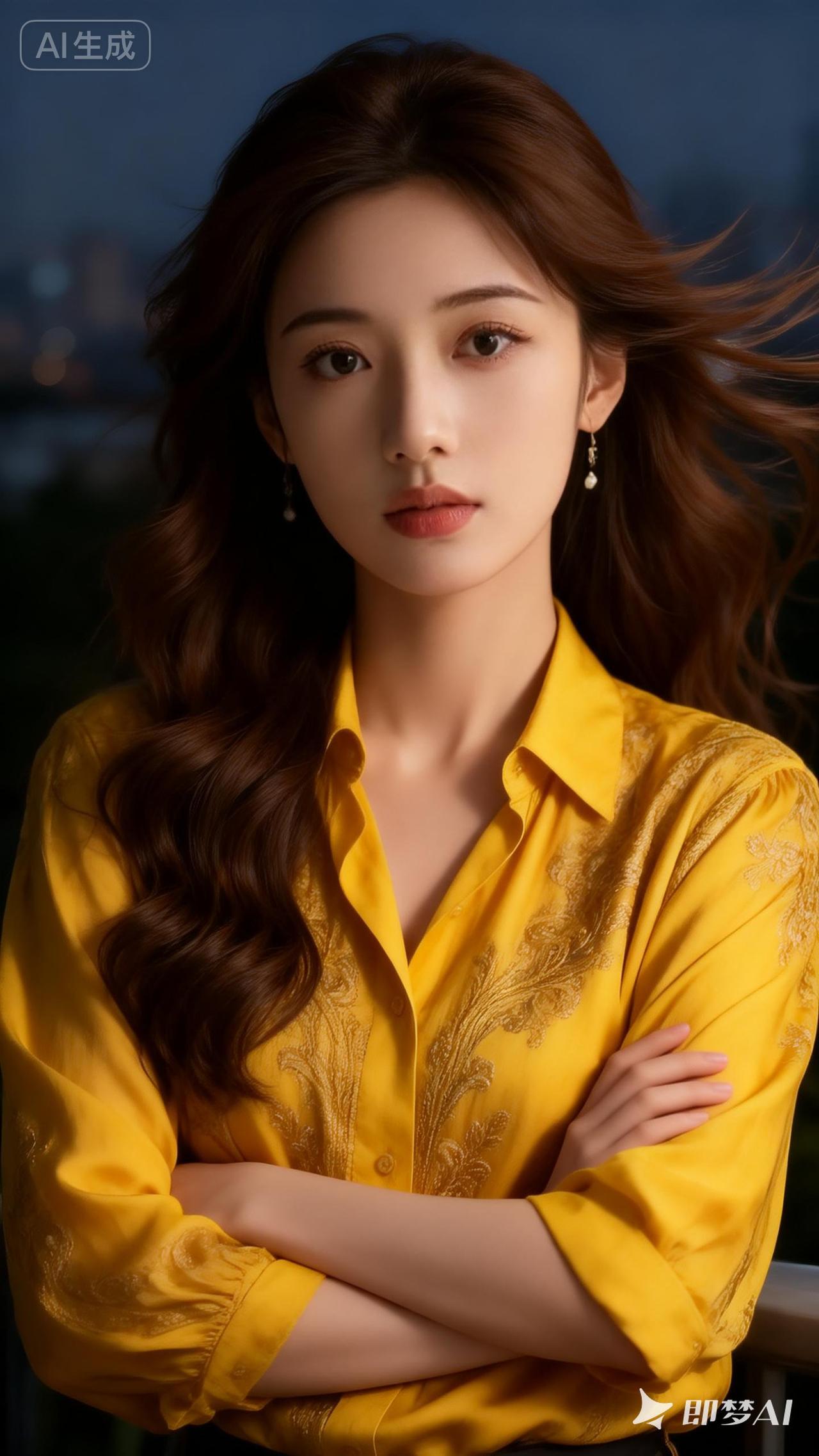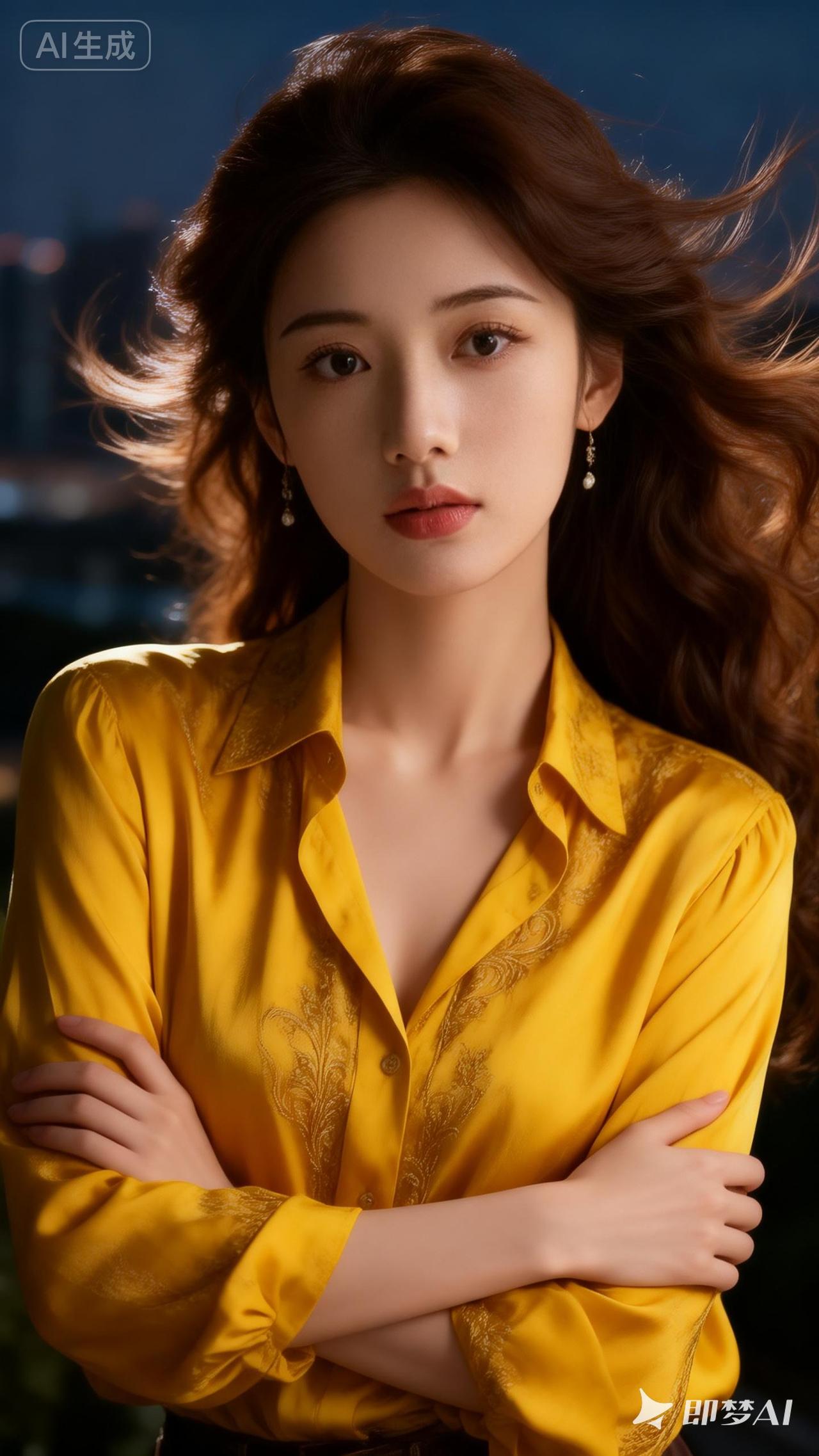 都市夜景下的优雅女性,黄色衬衫与长发相映成趣,尽显时尚魅力。