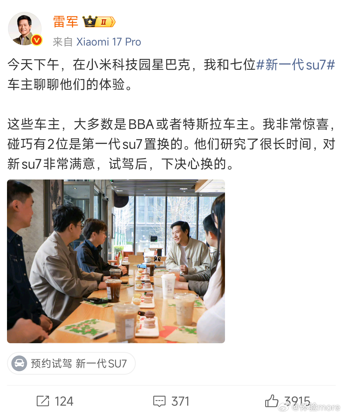 雷总今天邀请了几位新SU7车主来聊聊车主体验,恰好这些车主大多数是BBA或者特斯拉车主,前几天雷总直播时也提到过新一代SU7车主里曾是BBA车主的比例提升。小米新SU7车主很多来自BBA