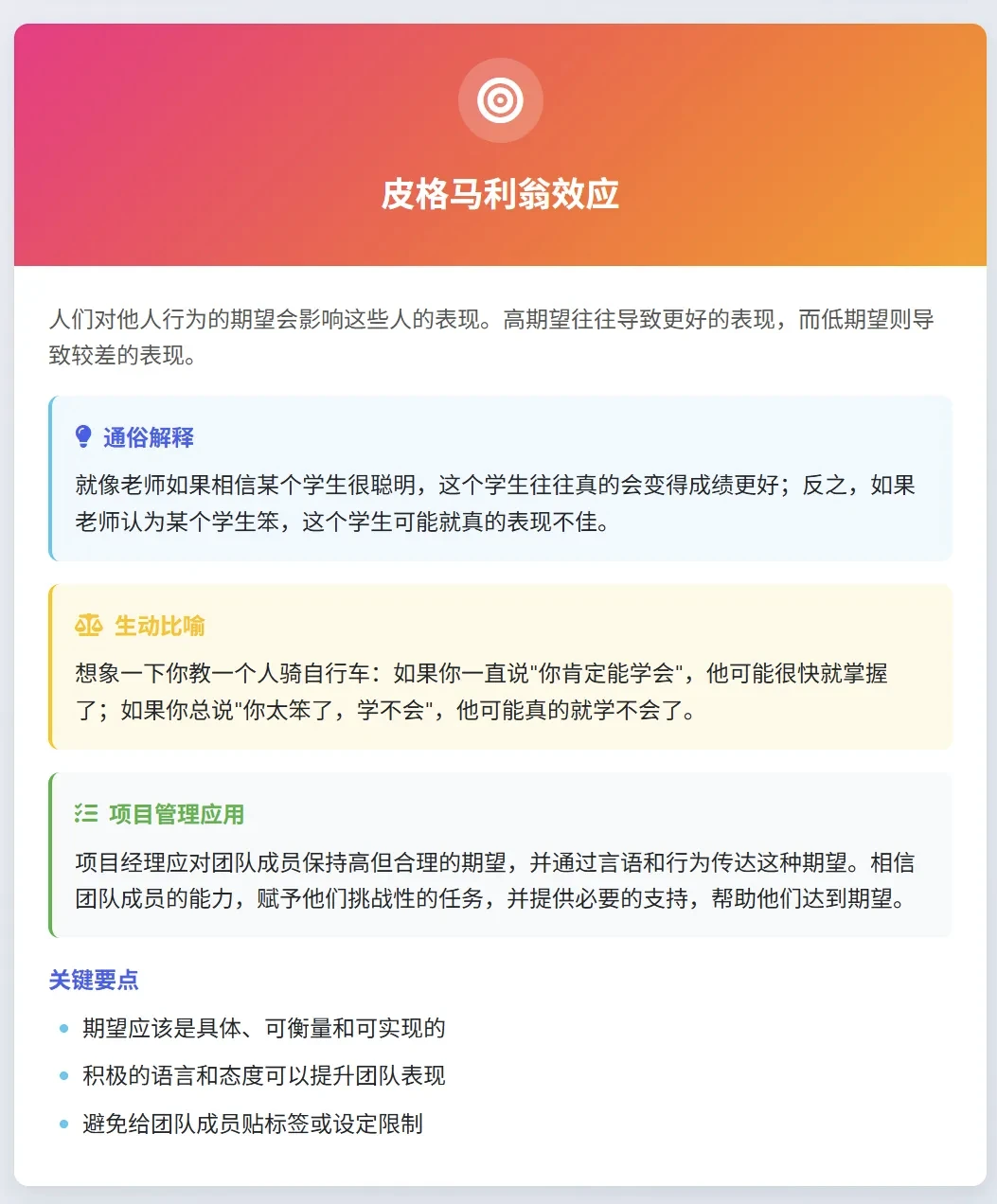 项目管理不仅仅是关于时间、预算和范围的技术性工作,更是关于人的工作。理解人性法则可以帮助项目经理更好地领导团队、解决冲突、激励成员,并最终提高项目成功率。这些法则源自心理学、行为经济学和组织行为学的研究,是每位优秀项目经理的必备知识。今天咱们用通俗易懂的语言和生动比喻,让这些复杂的概念变得简单明了!
