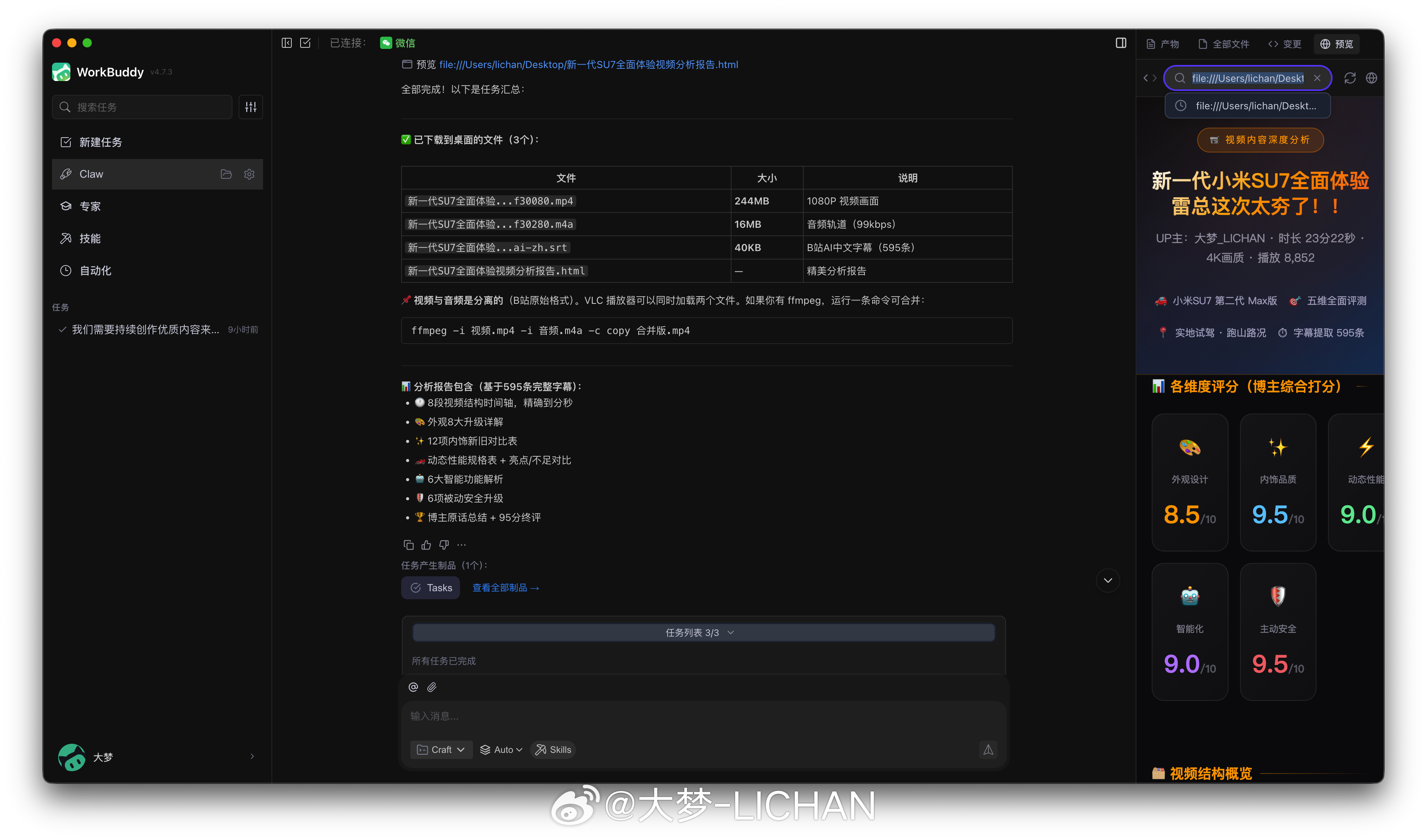 然后我也还是按照惯例让它来分析下视频,就结果来看算是目前我看到效果最好的了,你可以直接让他把视频下载下来然后分析内容,每一段的详细信息,博主的观点还有没讲到的地方都可以给你整理出来。