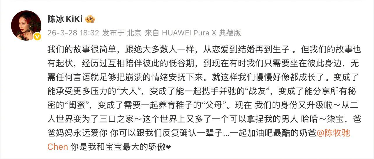 陈牧驰陈冰官宣结婚生子陈牧驰今天发的长文里,有对过往的坦诚,也有对当下的珍惜。陈牧驰坦然面对自己曾在艰难时期将坏情绪留给陈冰的愧疚,也真诚感谢了对方的包容。感谢粉丝支持的同时,也许下承诺会继续用角色证明自己,在这篇长文里看见了一个更立体、更真实的陈牧驰!陈牧驰感谢陈冰陪伴自己