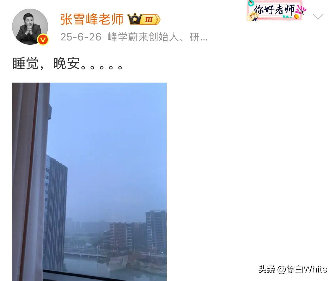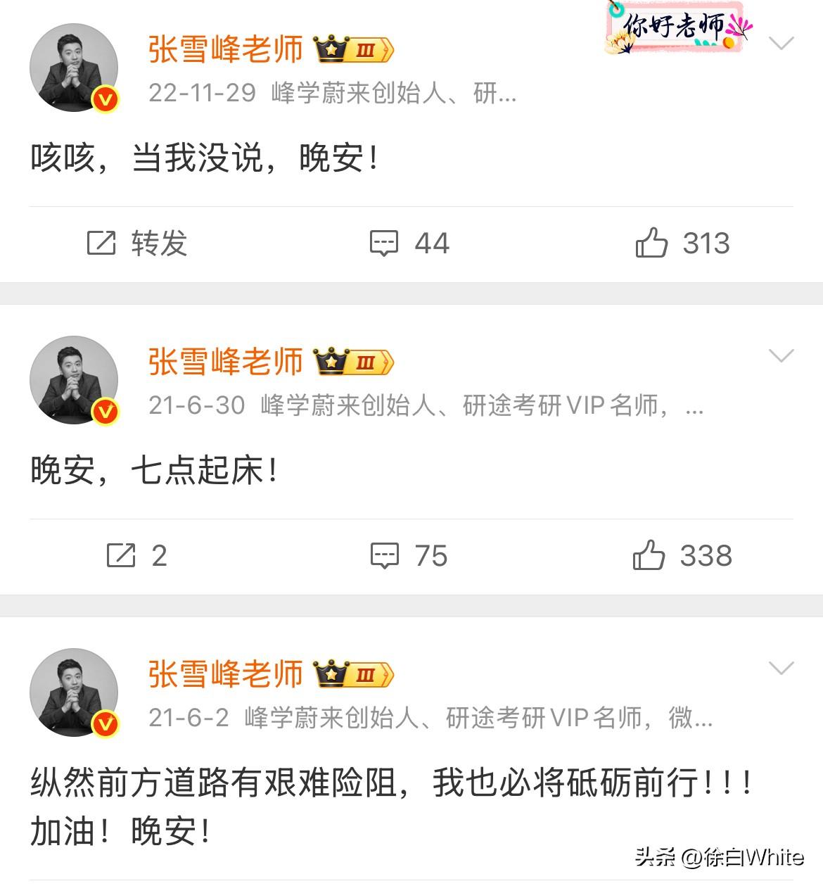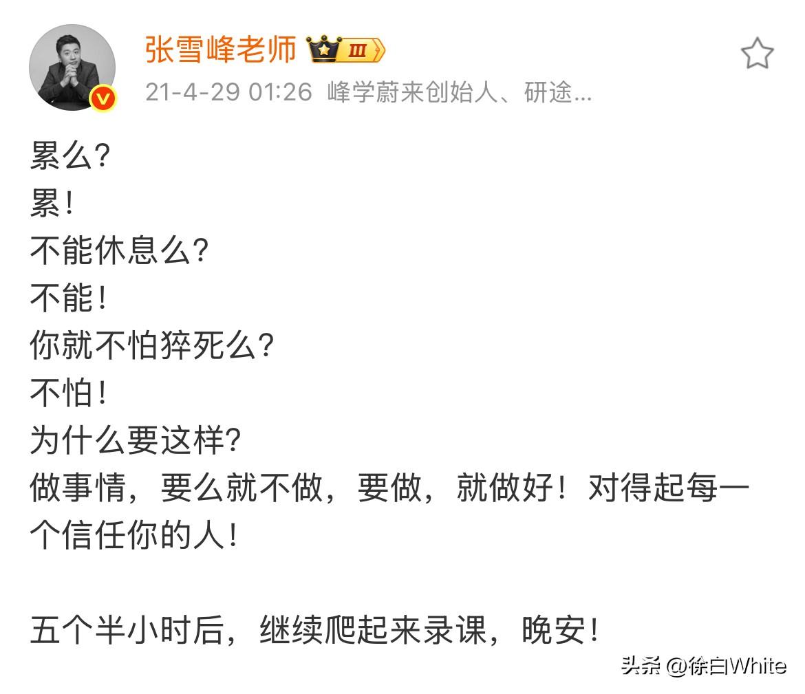 3月28日,这十年,张雪峰在凌晨跟大家说了无数次晚安,最后一次,大家先说! “先生,晚安,人间值得,记得早点回来!” “先生,晚安,这一觉睡好一点,久一点!” “先生,晚安,脚步停了,但精神未停!” “先生,晚安,您对的起所有信任您的人!” “先生,晚安,睡觉前没跑步,是不是有些不习惯,今天苏州千米长队,众人力挺您,您看到了么?在您的世界里,夺了冠军!” …………………… 跟张雪峰道晚安之余,别忘了跟自己道晚安,早点睡,晚点起,在生命面前,梦想微不足道,照顾好自己的身体,别让它透支!