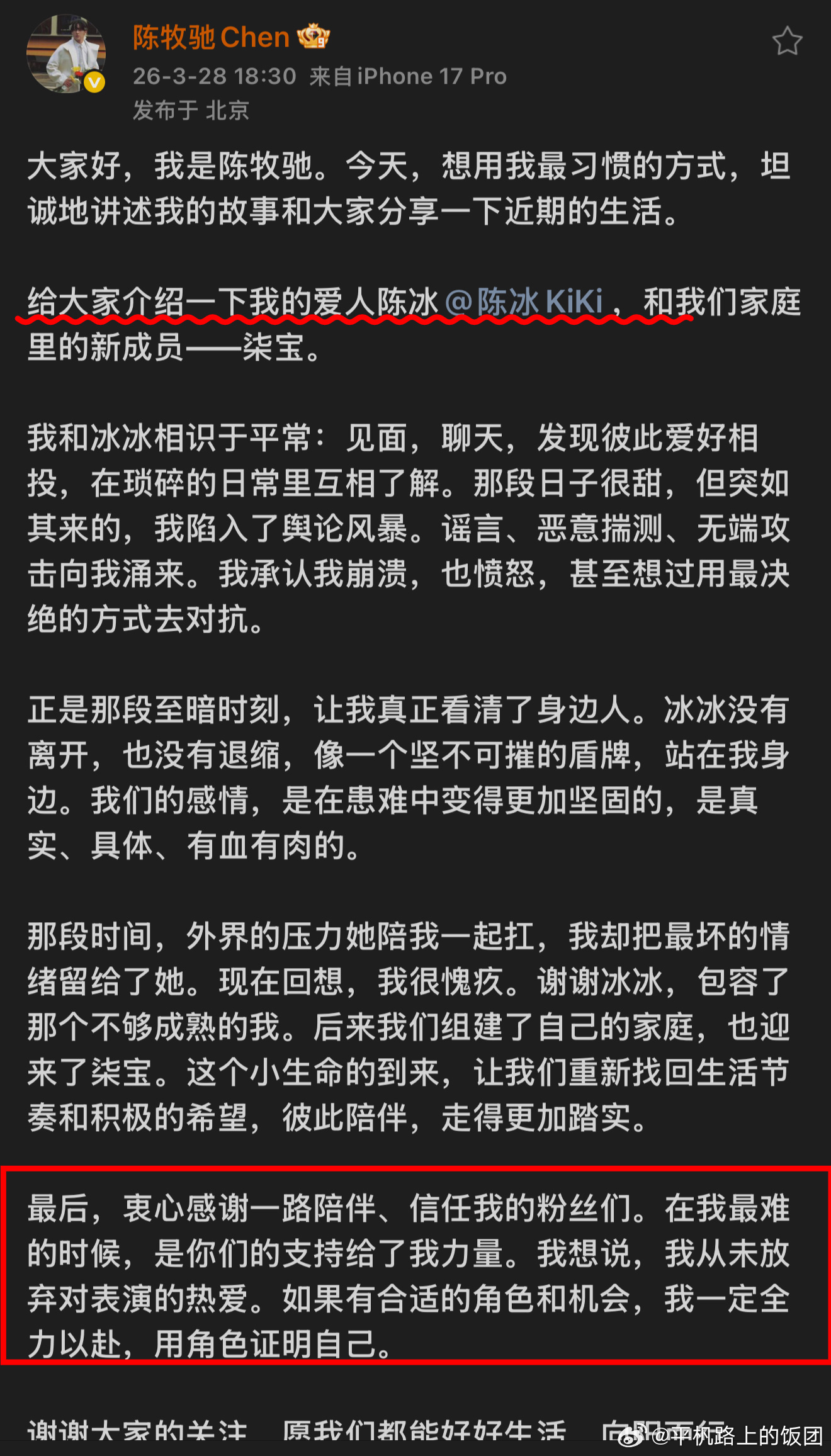 陈牧驰大粉23号发的微博一而再,再而三的强调陈牧驰和陈冰没有任何关系,陈牧驰今天官宣和陈冰结婚产子了